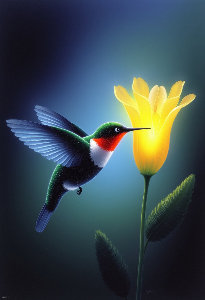 An ethereal image of a hummingbird sipping nectar from a flower made of pure light in the style of AETHR