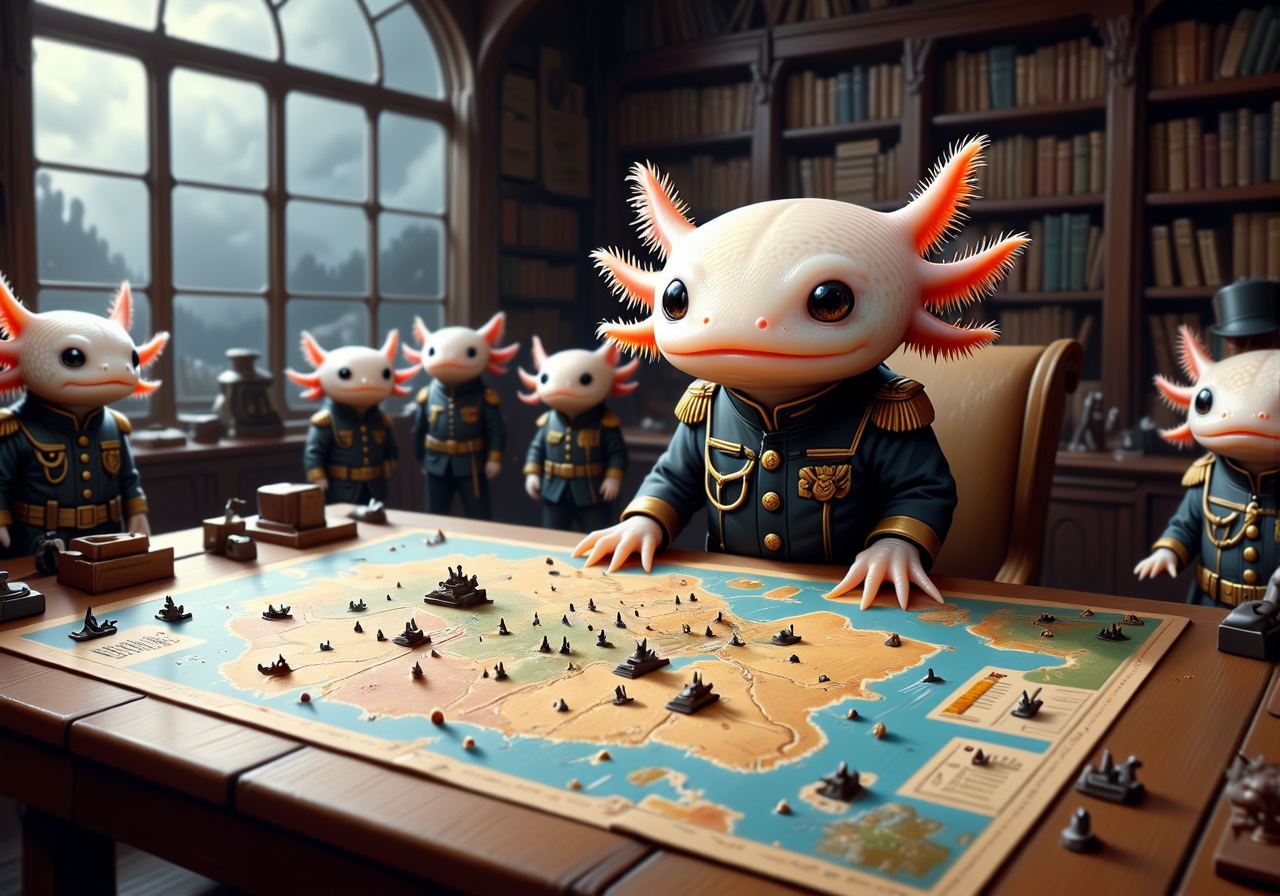 tilt shift of image of tiny cozyspooky axolotls wearing little outfits, An axolotl general stands before a massive map in a war room, its uniform pristine but its eyes shadowed with worry. The perspective is from above, looking down at the general and the map that stretches out across the table, covered in miniature figures representing armies, ships, and planes. The generalâÂÂs hands are pressed against the table, fingers splayed as it studies the map, its frills twitching with anxiety. Around the table, other axolotl officers stand at attention, their faces solemn as they await orders, the dim light of the room casting long shadows across their features. Behind them, the walls are lined with shelves filled with books and scrolls, while a large window reveals a dark, stormy sky outside. The painting captures the gravity of the situation with a detailed, almost cinematic style, using deep shadows and rich textures to convey the weight of the decisions being made and the uncertainty of the outcome., the axolotls have round black eyes and pink frilly gills, the tilt-shift effect creates a miniature scale appearance by softly blurring the background while keeping the primary subject in sharp, focused detail; the transition from clarity to blur is gradual, adding depth and emphasizing the small scale, with foreground elements subtly fading into softness; this effect enhances the sceneâs tiny, delicate feel, giving a lifelike sense of dimension and realism to each element, as if viewed in close-up with a shallow depth of field, CozySpookyStyle, axolotl<lora:Axomodel_Flux_V1.1.safetensors:1.0:1.0> <lora:CozySpookyStyleFlux.safetensors:0.55:0.55>