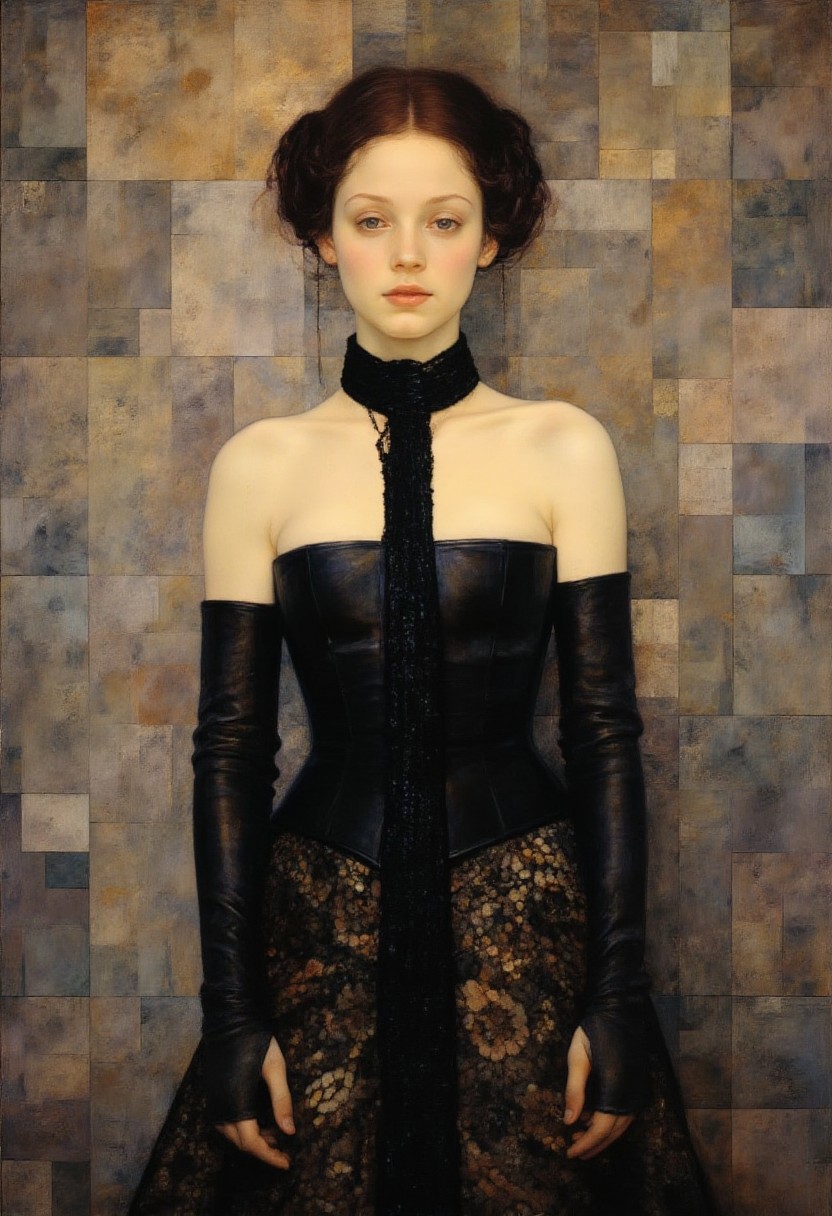 classical impressionist oil painting of a 23 year old woman wearing Padme Amidala Black Naboo Dress, tight black leather corset with black patterned dress, fingerless long black leather gloves, long black sequined scarf that cascades down her front, bare shoulders, cleavage, front view facing viewer