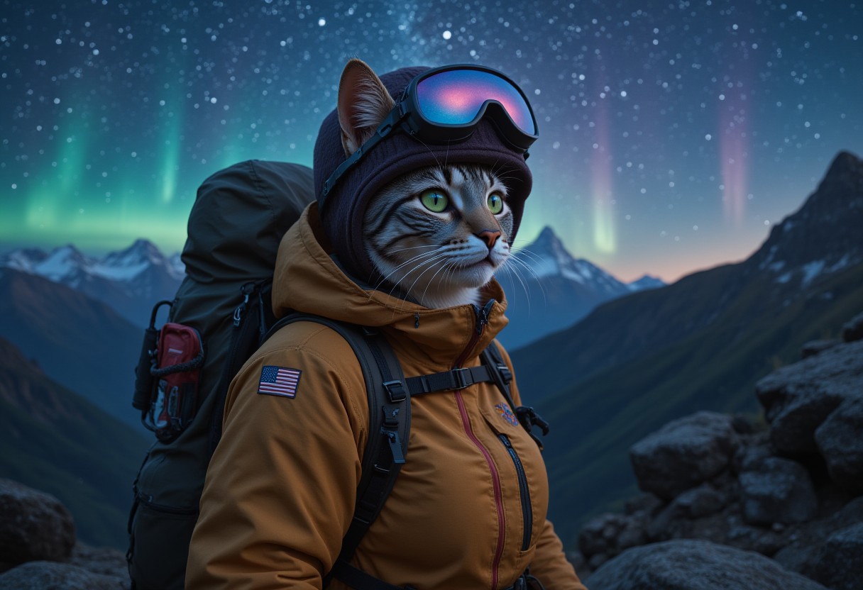 an cat adventurer in an sessert landscape wearing exploration gear, epic night sky