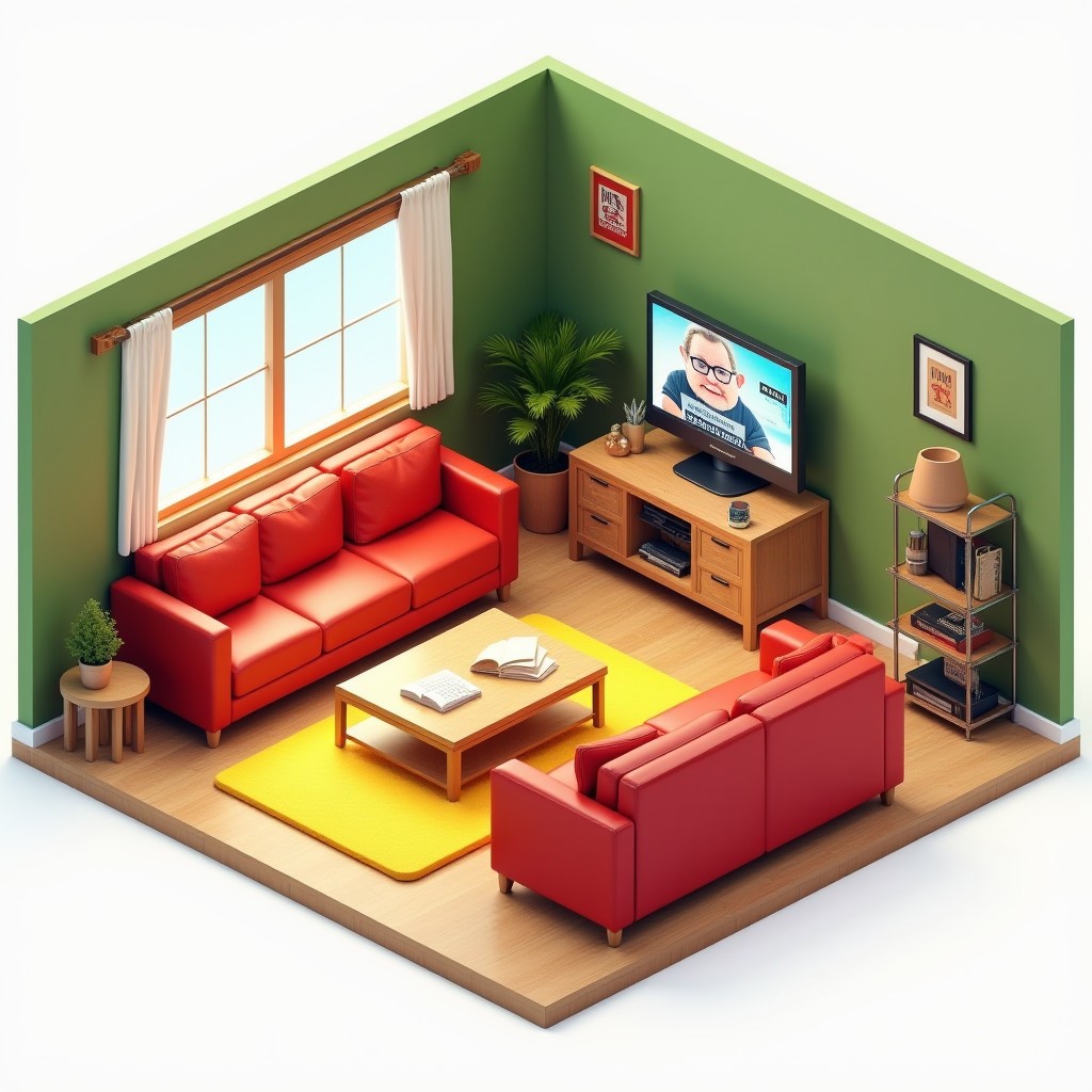 isometric photo of a living room with red sofas, TV, green wallpaper, wooden floor, yellow rug, TV is on showing news.