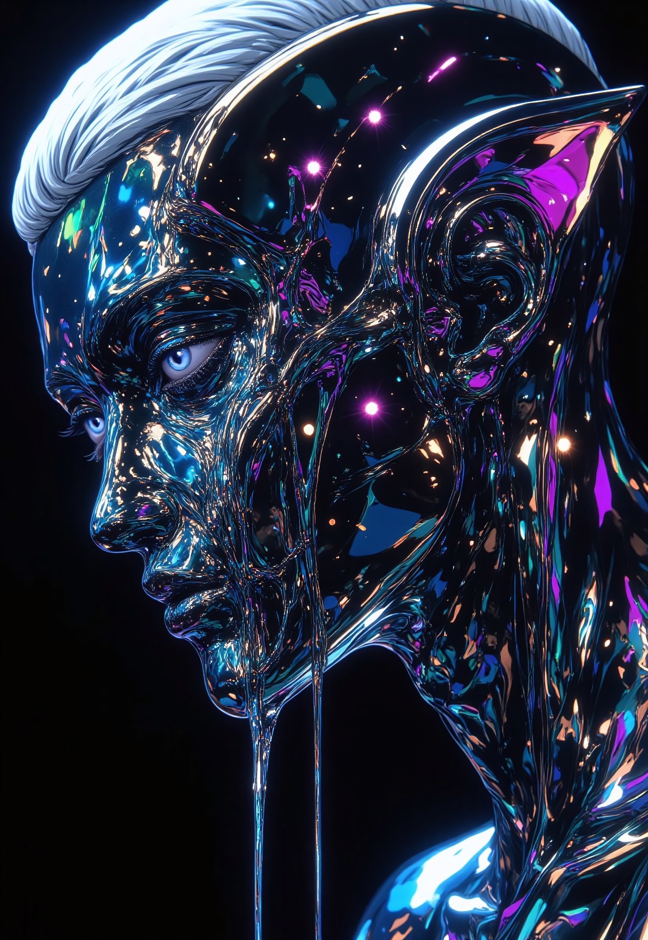 ((aidmaimageupgrader, aidmaMJ6.1, ne0nfant4sy)), A hyper-realistic, face close-up portrait of a woman with striking, very short white hair, side-trimmed and expertly side-faded, facing the viewer with an expression that conveys both strength and mystery. Her eyes are partially closed, exuding a futuristic, serene presence. The left side of her face is adorned with an intricately detailed chrome mold, seamlessly integrated into her skin, partially covering her left eye. The chrome mold, designed with over 10,000 razor-thin chrome lines, extends outward in straight, rigid formations, resembling molten cheese strands but with a sleek, metallic finish. The chrome has a high-polished, reflective surface that catches and refracts an ethereal, neon-blue and magenta glow, adding a surreal touch. Sparkles embedded within the mold enhance its futuristic, otherworldly essence. Some sections of the chrome are semi-solid, with metallic drips that flow down her face in fluid dynamic patterns, suggesting a seamless merge between technology and organic form. Subtle holographic projections trace the edges of the chrome, emitting faint, pulsating neon symbols and geometric shapes that flicker and shift, adding layers of surrealism. The top of her head is in frame, showcasing the intricate chrome details, while the body remains out of frame, keeping focus on the striking, surreal facial composition that blends technology with artistic surrealism.