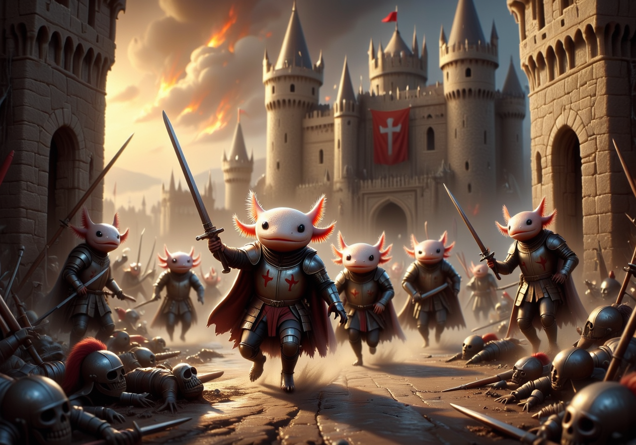 tilt shift of image of tiny cozyspooky axolotls wearing little outfits, In a dramatic scene of medieval warfare an axolotl knight clad in heavy plate armor charges through a breach in a castle wall its sword held high as it leads the assault behind it the castle is in flames with smoke billowing into the sky while the ground beneath is littered with the bodies of fallen soldiers the knightâÂÂs expression is one of fierce determination its frills pressed flat against its head as it drives forward through the chaos the painting captures the intensity and violence of the battle through the use of bold brushstrokes and dramatic lighting emphasizing the contrast between the dark smoke-filled sky and the bright flashes of steel., the axolotls have round black eyes and pink frilly gills, the tilt-shift effect creates a miniature scale appearance by softly blurring the background while keeping the primary subject in sharp, focused detail; the transition from clarity to blur is gradual, adding depth and emphasizing the small scale, with foreground elements subtly fading into softness; this effect enhances the sceneâs tiny, delicate feel, giving a lifelike sense of dimension and realism to each element, as if viewed in close-up with a shallow depth of field, CozySpookyStyle, axolotl<lora:Axomodel_Flux_V1.1.safetensors:1.0:1.0> <lora:CozySpookyStyleFlux.safetensors:0.85:0.85>