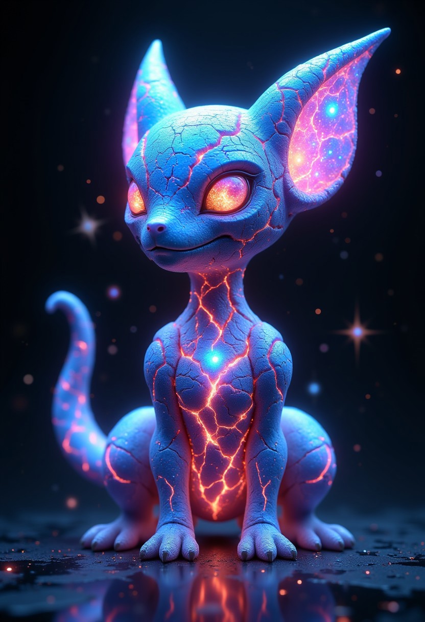 Glowing galaxy cracks, A sleek, glowing version of Lucario with determined, piercing eyes. His blue fur cracks like crystalline energy, with glowing fissures in vibrant galaxy colors—shades of deep purples, bright blues, and neon reds. The cracks shimmer with cosmic power, as if Lucario is channeling the energy of distant galaxies. His aura sensors glow with pulsating cosmic light, and the dark background accentuates his luminous form. Star-like particles swirl around him, adding to the sense of control and cosmic balance. The scene merges Lucario's cool, martial look with a powerful cosmic aura.