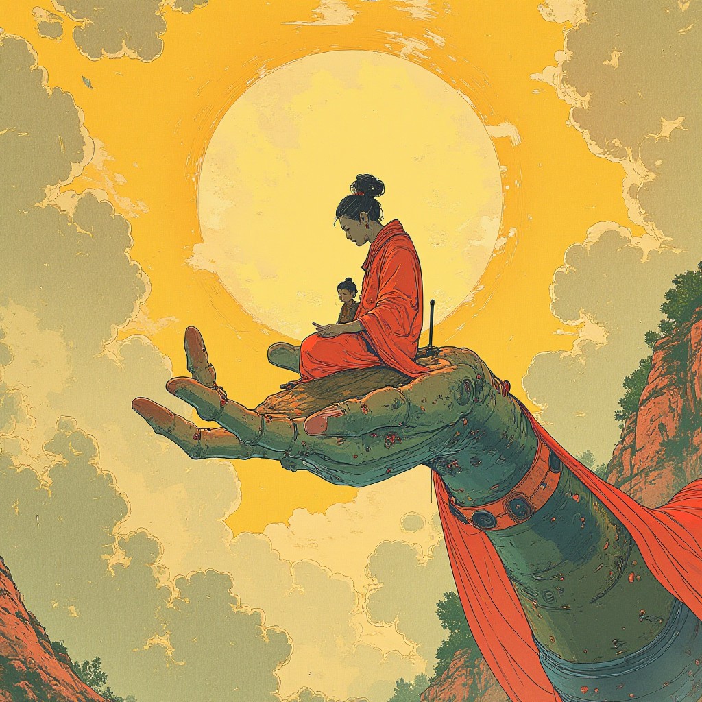 Dunhuang Art, minimalism illustration, mural art, an extremely tiny monk sitting on the giant hand of Guanyin an extremely tiny monk sitting on the giant hand of Guanyin, perfectly interwoven curves, chinese ink style, chinese freehand style, frosted texture, gold red indigo color scheme, dunhuang mogao grottoes color scheme, ripples of color diffusing, printmaking style, layered curves, rich color, made of transparent frosted glass, simple background, bright environmental lighting, warm and shining tone, capillary phenomenon, diffraction, total internal reflection