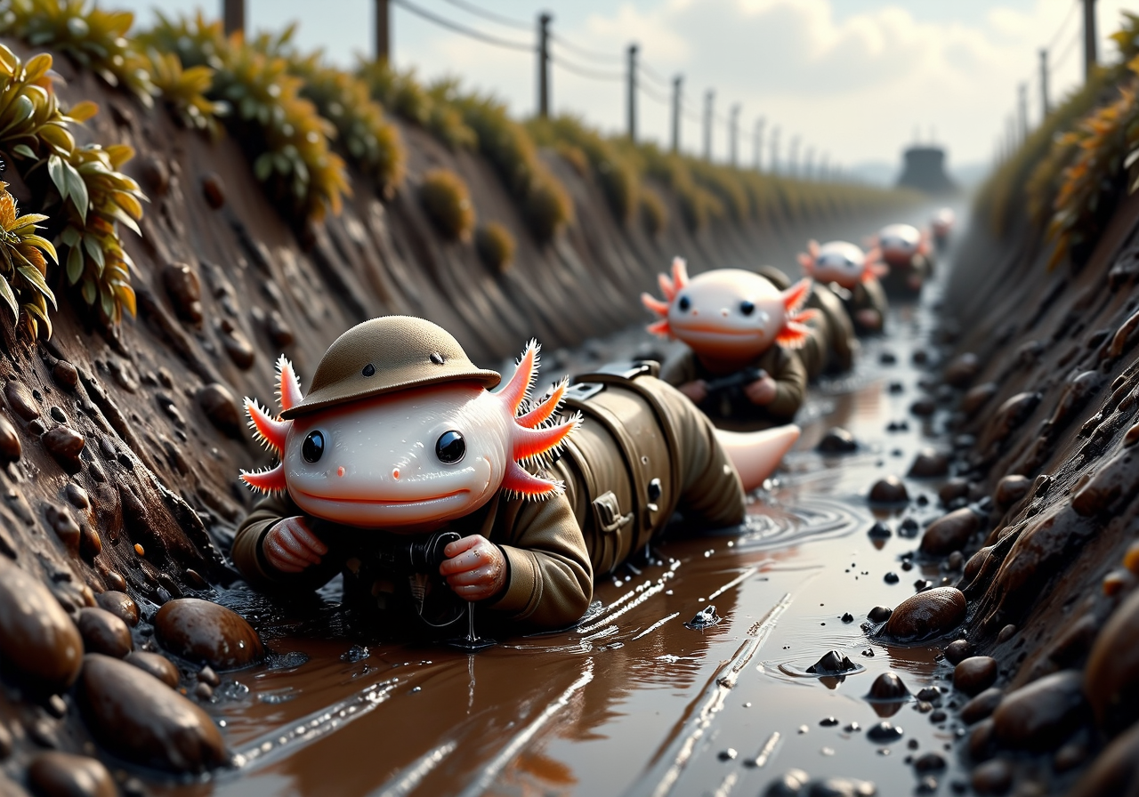 tilt shift of image of tiny cozyspooky axolotls wearing little outfits, An axolotl soldier, its uniform caked in mud and grime, lies prone in a waterlogged trench, clutching a bolt-action rifle with both hands, its body tensed as it peers through the iron sights. The angle of the scene is low, almost at ground level, emphasizing the claustrophobic environment of the trench. The walls of the trench, made of rough wooden planks, rise up on either side, slick with mud and dripping with water. The axolotlâÂÂs frills are flattened against its head, soaked and heavy, as it tries to steady its breathing. In the distance, the dark silhouette of no man's land stretches out, dotted with barbed wire and shell craters, under a sky choked with smoke and the distant flashes of artillery. The painting captures the intense focus and desperation of the soldier, rendered in a gritty, hyper-realistic style that emphasizes every detail, from the texture of the mud to the tension in the axolotlâÂÂs muscles., the axolotls have round black eyes and pink frilly gills, the tilt-shift effect creates a miniature scale appearance by softly blurring the background while keeping the primary subject in sharp, focused detail; the transition from clarity to blur is gradual, adding depth and emphasizing the small scale, with foreground elements subtly fading into softness; this effect enhances the sceneâs tiny, delicate feel, giving a lifelike sense of dimension and realism to each element, as if viewed in close-up with a shallow depth of field, CozySpookyStyle, axolotl<lora:Axomodel_Flux_V1.1.safetensors:1.0:1.0> <lora:CozySpookyStyleFlux.safetensors:0.55:0.55>