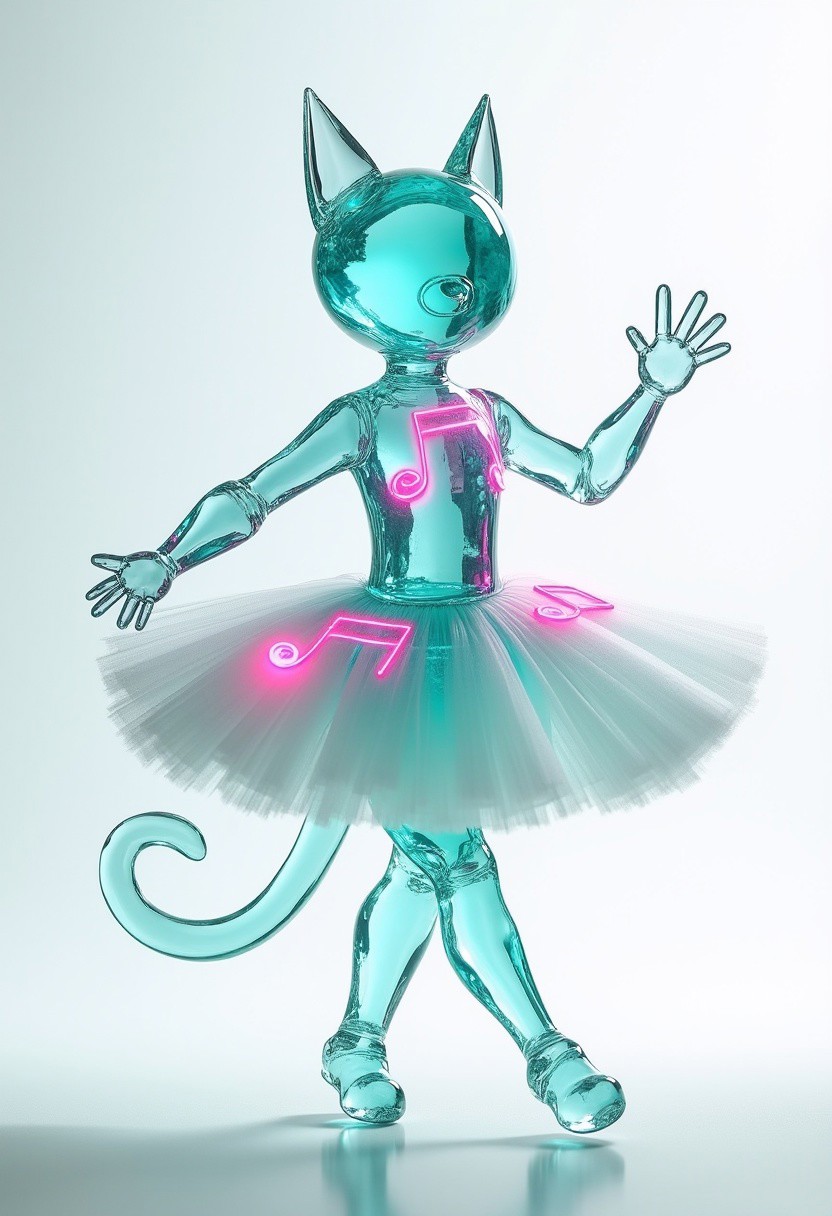 glass cat in transparent crystal dress, ballerina, teal crystal pillars lit by pink lights all around,dancing,shining note signs inside her body, curls of smoke, white background, masterpiece, vivid colors, high res, hyper-detailed, ultra-sharp