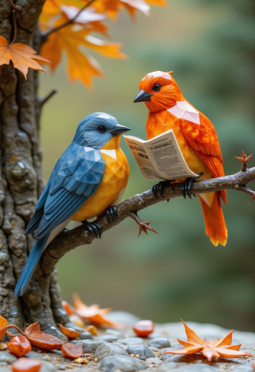 a crafted gemstone model in the style of cklg featuring birds sitting on a telephone line reading newspaper. Cute autumn scene. The entire model is made from finely detailed gemstones