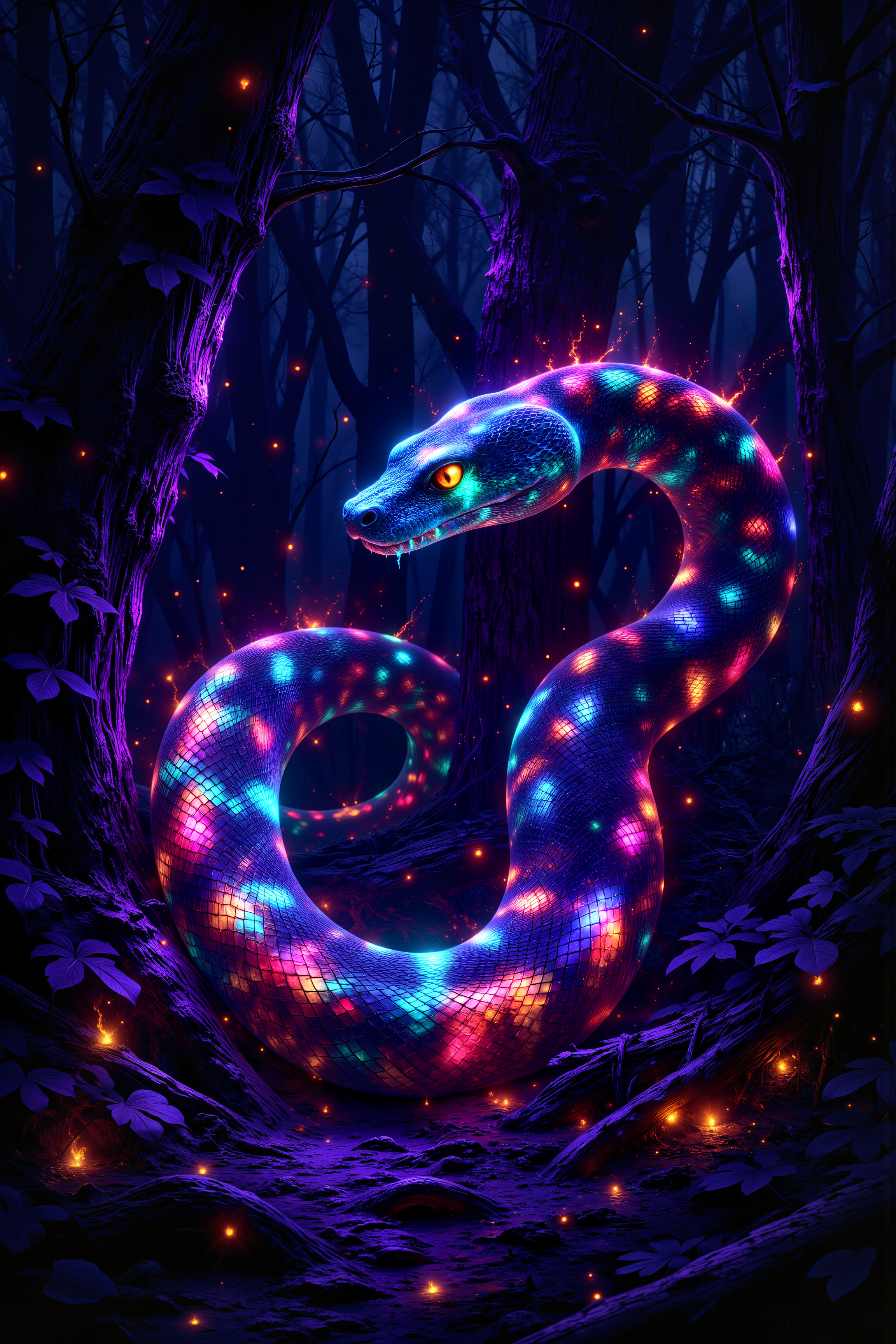 FLUORESCENT, GLOW, a massive, glowing snake winds through the dense, fluorescent jungle, its scales shimmering with every color of the rainbow. The jungle floor is covered in bioluminescent fungi, casting a soft, eerie light as the snake slithers through. Its eyes glow with an intense, otherworldly light, illuminating the thick underbrush in front of it. The trees around the snake are ancient and gnarled, their leaves glowing softly with strange, purple hues. The snakeâs body coils around a towering tree, blending into the fluorescent jungle, while fireflies float lazily in the air, adding to the dreamlike atmosphere. The textures of the glowing scales, the jungle foliage, and the soft light create a surreal, vibrant scene.<lora:DnDDarkestFantasy:0.5><lora:FluxMythP0rtr4itStyle:0.75><lora:Dever_Flux_Enhancer:0.5><lora:Aura_Flux-000010:0.6>