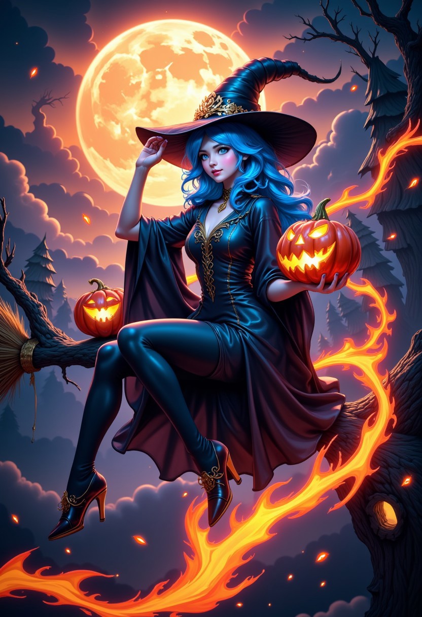 Beautiful girl of a witch, with a crystal -blue luminous eyes, blue hair, an ideal figure, sits on a broomstick, holds a Halloween pumpkin in one hand, a fiery train stretches behind a broom, a huge full moon, a dark terrible forest, clouds, clouds, clouds, clouds, clouds