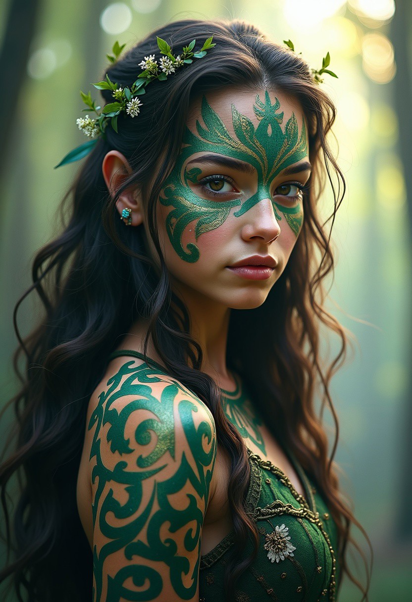 Create a hyper-realistic portrait of a beautiful girl adorned with intricate Celtic war paint on her face. The vibrant colors of the paint—deep greens, rich blues, and metallic golds—contrast strikingly against her fair skin. Her long, flowing hair cascades over her shoulders, intertwined with natural elements like leaves and small flowers, enhancing the ethereal quality of the image. The background is a misty forest, softly illuminated by dappled sunlight filtering through the trees, creating an enchanting atmosphere. The girl's expression is fierce yet captivating, embodying strength and grace, while her eyes sparkle with determination. Incorporate elements of traditional Celtic patterns in the war paint, adding depth and symbolism to the artwork, showcasing both beauty and warrior spirit.