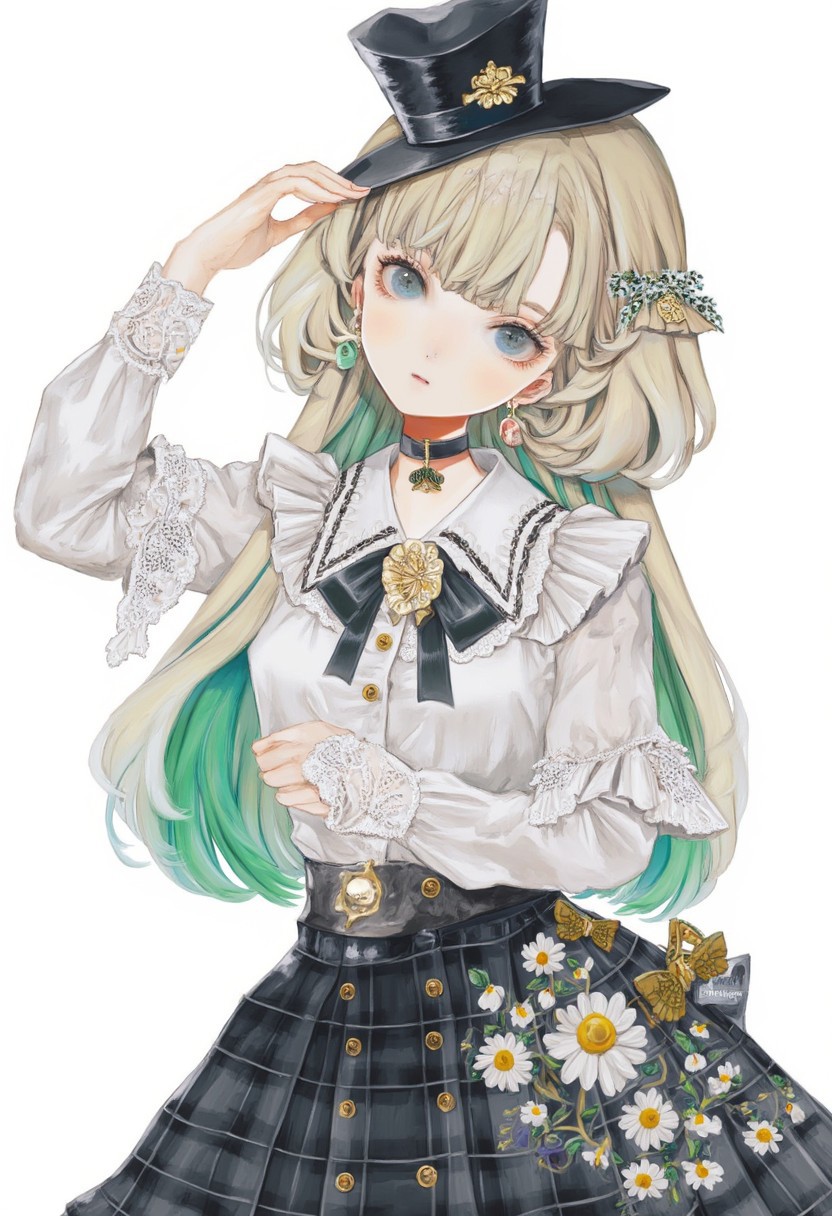 by lolita_impasto_style,A girl is wearing a plaid skirt with white flowers on it,1girl, adjusting hair, alternate costume, black choker, black skirt, blonde hair, blue eyes, blunt bangs, bowtie in mouth, buttons, cat earrings, center frills, choker, cowboy shot, earrings, framed, frilled shirt, frills, gradient hair, green hair, hair flaps, hair ornament, hairclip, hat, jewelry, lace, lace choker, long hair, long sleeves, looking at viewer, mini hat, mouth hold, multicolored hair, overskirt, shirt, skirt, solo, tilted headwear, virtual youtuber, white shirt, white skirtspot color,