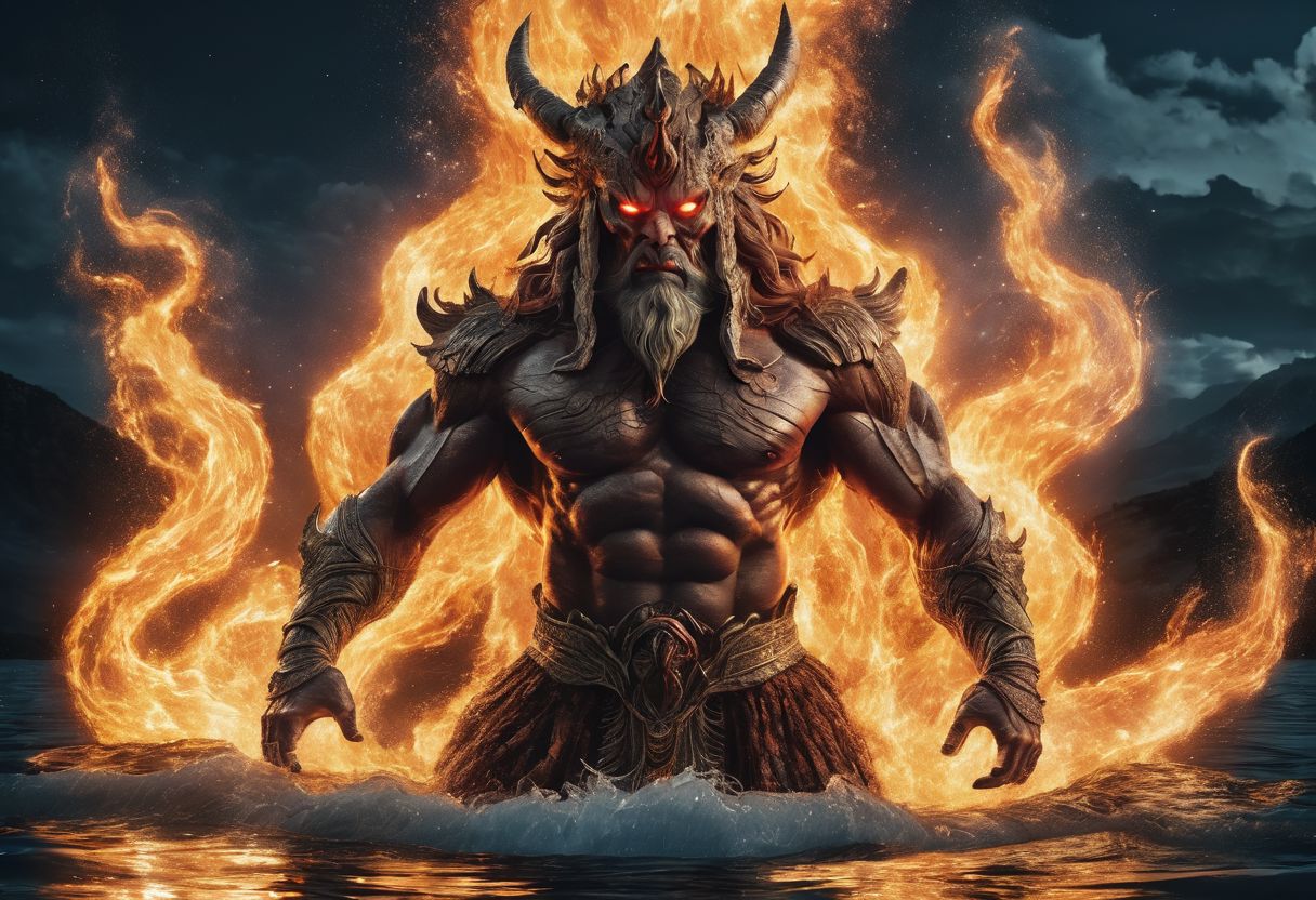 Ultra high-quality photograph of a fire god emerging from the water at night under a full moon background, mystical, ethereal, cinematic, detailed, mystical lighting, 8k resolution