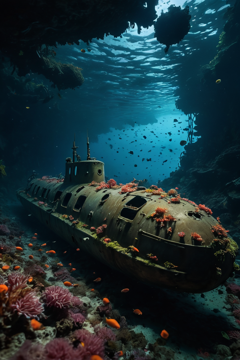 A haunting, underwater scene where a sunken, abandoned submarine lies covered in coral and anemones, its portholes glowing with an otherworldly light, as a school of ghostly, bioluminescent fish dart through the wreckage, chased by a dark, shapeless presence lurking in the depths. 8K