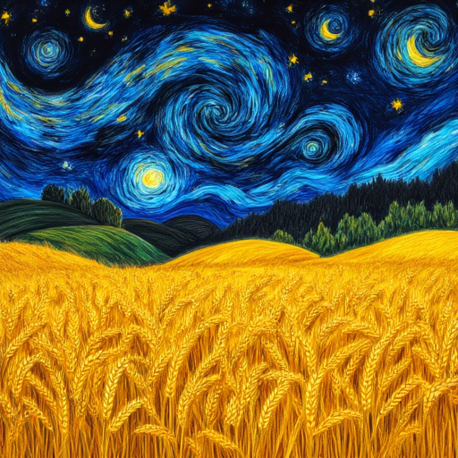 A mesmerizing nighttime wheat field under a swirling, starry sky, reminiscent of Van Gogh's artistic style. The golden wheat sways gently, illuminated by the soft glow of celestial light, creating a vivid contrast against the deep blue and black hues of the night. The sky is alive with vibrant yellow crescent moons, twinkling stars, and swirling patterns of cosmic energy, evoking a sense of movement and wonder. In the distance, rolling hills and shadowy green trees add depth and serenity, grounding the scene. The composition exudes a sense of both tranquility and awe, blending natural beauty with the surreal. The rich textures and bold colors create a dreamlike atmosphere, inviting the viewer to lose themselves in the harmony of earth and sky. The vibrant interplay between light and dark enhances the emotional resonance of this ethereal landscape, making it a captivating fusion of nature and imagination.