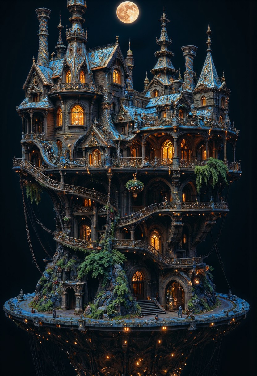 Ultra-high resolution photorealistic architectural composition with cinematic lighting. A fantastical Victorian mansion with an impossible hourglass silhouette, defying gravity: Architecture: - Massive top section spreading outward like an umbrella or mushroom cap - Narrow "waist" in the middle creating dramatic tension - Substantial base anchoring the structure - Top floor features multiple overlapping rooms jutting outward - Middle section compressed with twisted support columns - Delicate wraparound balconies suspended from upper mass - Ornate Gothic windows increasing in size toward the top - Hidden steel cables and support chains adding to the mystique Structural Details: - Upper section: Expansive rooms with bay windows and turrets extending outward - Middle section: Compressed Victorian architecture with ornate buttresses - Base section: Solid stone foundation with grand entrance stairs - Multiple spires and chimneys crowning the top - Intricate woodwork details becoming more elaborate toward top - Brass and copper mechanical elements suggesting hidden support systems Lighting and Atmosphere: - Dramatic full moon backlighting the structure - Warm golden light spilling from windows - Cool blue moonlight on upper surfaces Materials and Environment: - Weathered wooden siding with authentic grain - Blue-grey slate roofing with copper trim - Tarnished metalwork and aged brass details - Moss and ivy growing naturally on lower sections