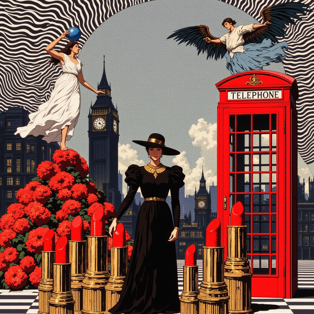A surreal and dreamlike collage composed of various elements, blending contrasting textures and imagery. The background is black and white, featuring a dynamic zigzag pattern that adds movement to the scene. At the center stands a vibrant red telephone booth, emblazoned with the number 5, acting as a focal point. To the left, several red lipsticks are arranged in a pyramid-like formation, adding a bold, graphic element to the composition. Above the booth, a woman in a black dress with gold accents and a matching black hat stands poised. She is placed in front of a cityscape, complete with tall buildings and a distant clock tower, lending a sense of grandeur to the scene. In the top left corner, two women dance gracefully in mid-air. One wears a flowing white dress, while the other dons a flowing blue dress, their movement captured in an ethereal, dreamlike manner. The woman in black holds a blue ball, further enhancing the surreal tone, while the second woman is adorned in a black and gold outfit, with a striking hat and necklace, creating a harmonious balance of color. The overall color scheme is dominated by black, white, and gold, offering a stark contrast to the vibrant red telephone booth and the distant cityscape, creating a visually striking and whimsical atmosphere. The collage is a blend of modern, fantastical, and vintage elements, inviting the viewer into an abstract, dreamlike world.