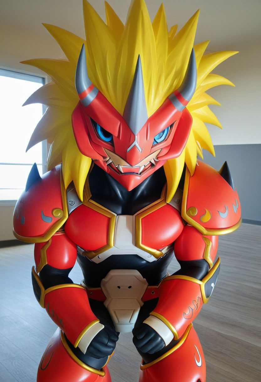 deflated, wrinkled, folded, a handsome agunimon boy, digimon, indoors