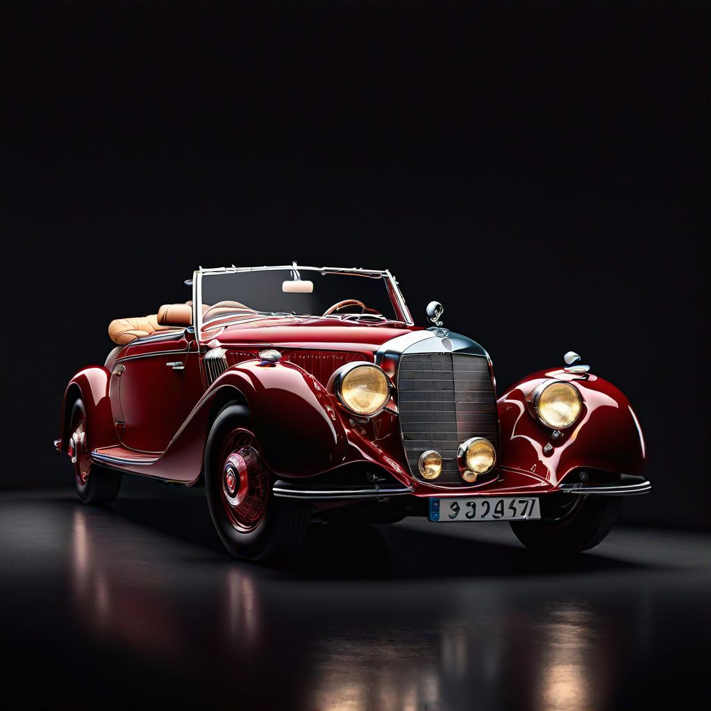 Ultra realistic full body color pencil drawn portrait of the classic burgundy red 1933 Mercedes-Benz 370 S Mannheim Sport Cabriolet, Dark theme, dynamic lighting, (soft shadows), (soft focus), (photo realistic), uhd, 8k