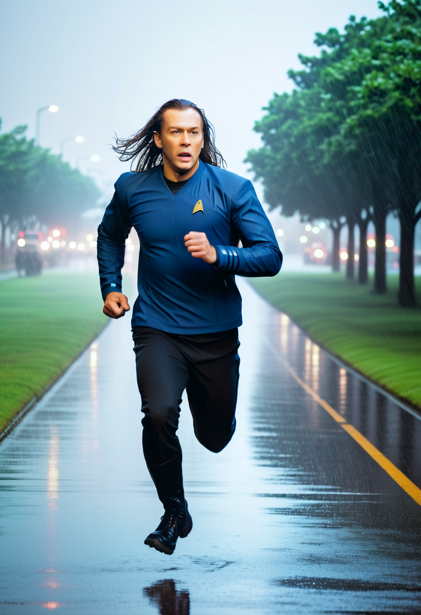 a man with long hair in blue stsnwunf uniform running in the rain,night,city,heavy rain,pursuit,thriller,action,cinematic,dynamic,fear,masterpiece, best quality, soft light, bokeh, real shadow, cinematic, subsurface scuttering