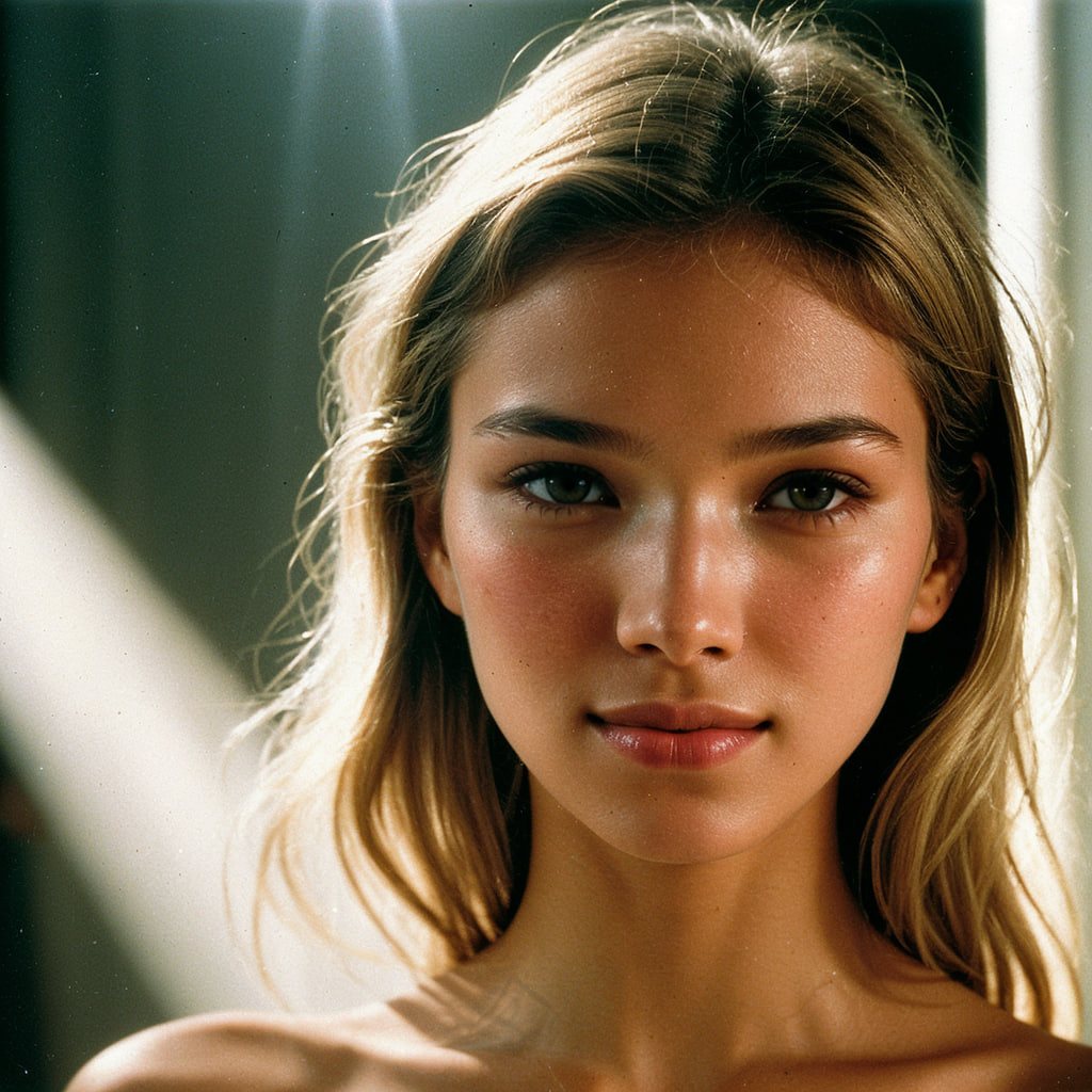 analog photo by Ilford Delta 3200,closeup photo in beam of sunlight, strait line of light on face of gorgeous goddess sasha luss BREAK (skin imperfections,detailed skin),smile