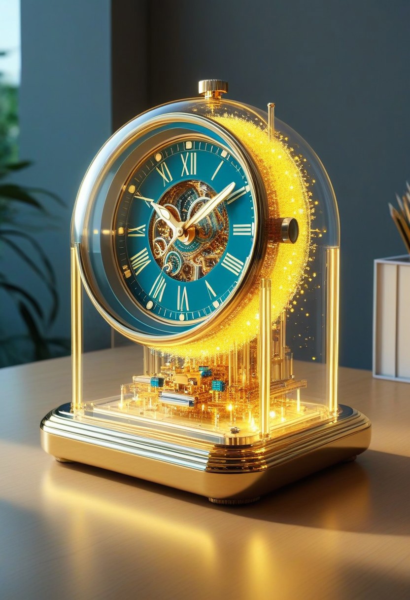 masterpiece, best quality, a wrist clock in qu4ntum style, on a desk, glass, at day, sunshine, godrays, particles, neon glowing,