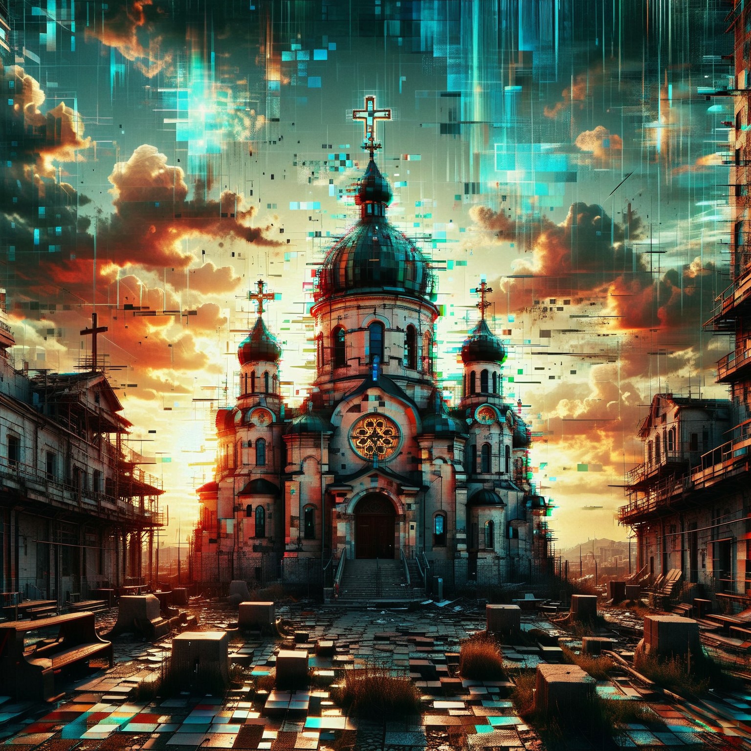 glitch style, orthodox church, architecture, pristine facade, nuclear wasteland, glitch clouds, stained glass, flickering light, radioactive sky, crumbling ruins, eerie contrast, dusk