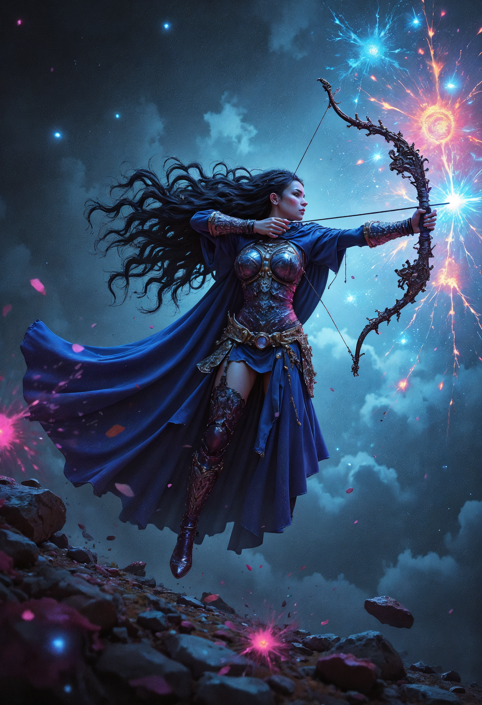 A low-angle action shot of a celestial huntress mid-leap, her bow drawn and glowing with ethereal energy ready to release a brilliant arrow that illuminates her face, Her flowing cloak and braided hair streak dynamically behind her accentuating her momentum, The abstract cosmos serves as a backdrop with swirling nebulae and sparkling stars framing her form, The perspective highlights the luminous ornate patterns on her armor and weapon, The figure is hyperdetailed, with every texture on her bow and shimmering tattoos presented in the best quality and high resolution,
