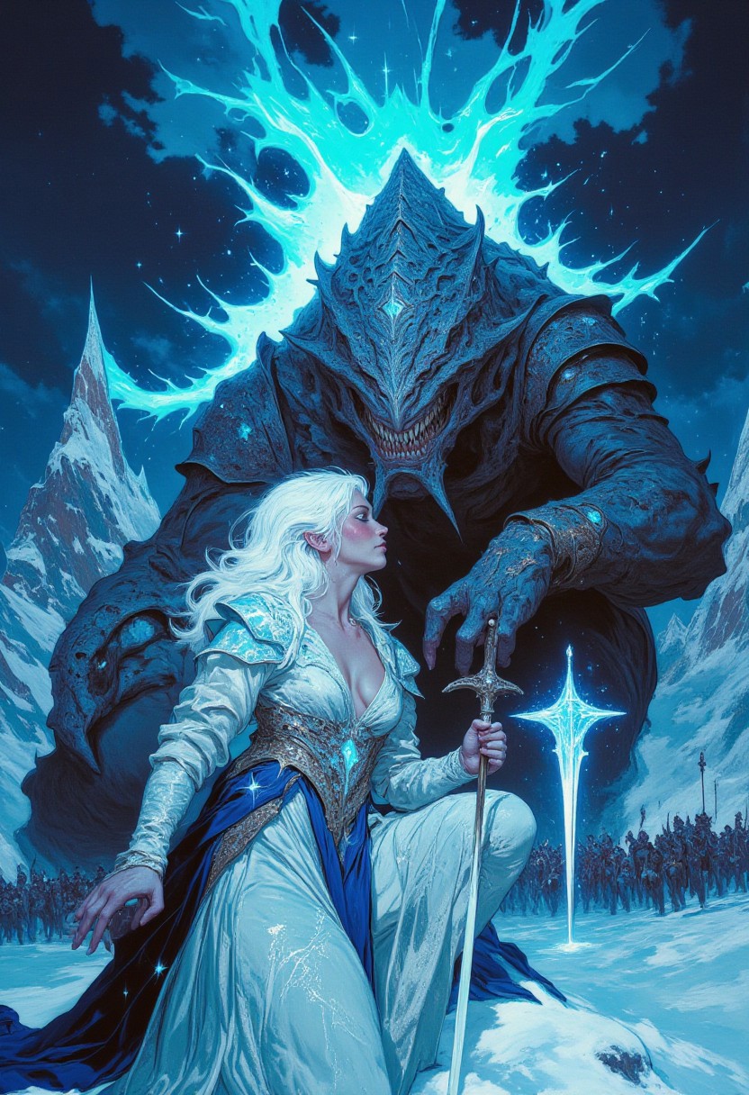 A hyper-detailed, cinematic dark fantasy scene presents the Moonlit Duchess, an ethereal beauty with porcelain skin and a cascade of shimmering white hair adorned with icy sapphire pins. She wears a regal, silver-threaded gown that gleams like woven moonlight, the bodice embroidered with constellations that shift as if alive. Her piercing ice-blue eyes glow in the twilight, exuding wisdom and quiet menace. The frozen tundra stretches endlessly behind her, jagged glacial spires rising into the storm-laden sky, crackling with raw elemental power. At her side looms the Frost Titan, an enormous, hulking beast of living ice, its body covered in jagged crystalline armor, its breath forming thick clouds in the frigid air. Its deep, resonant growl reverberates through the landscape as it kneels before the Duchess, awaiting her silent command. In the distance, a legion of shadowed figures marches through the snowdrifts, their glistening blades reflecting the cold fire of the aurora above. The battle for the frozen kingdom is about to begin.