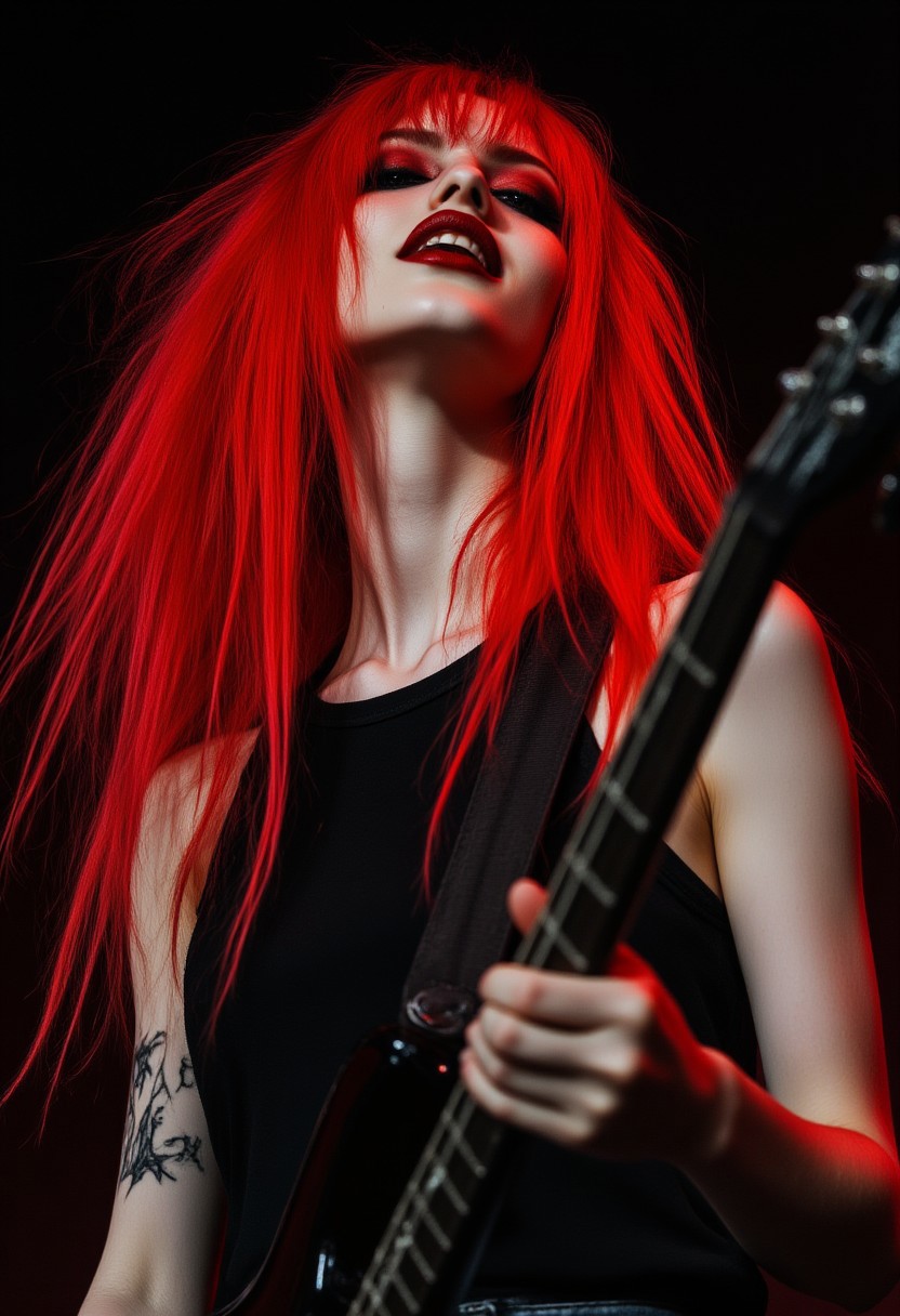 FictionalEmber,bright red hair,heavy black eye makeup and intense red lips. Playing a black guitar at a concert.
