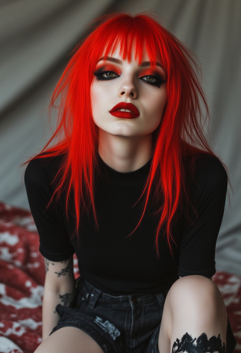 FictionalEmber,bright red hair,heavy black eye makeup and intense red lips. In full latex bodysuit, high heels