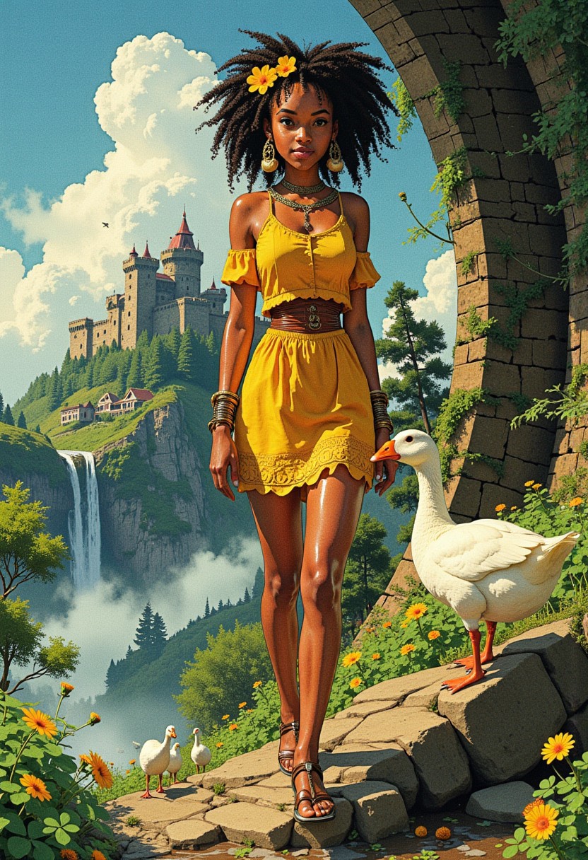 Solomon Islander shag titian hair (young woman), (druid:1.2), anime, illustration, (extremely detailed), (portrait), (standing:1.2), (happy smile), flower in hair, glossy lipstick, celtic necklace, wave earrings, loincloth, (sandals), Dark Yellow (druid short dress), (legs), heels, (sharp focus), fantasy, (beautiful celtic landscape:0.9), a group of white geese walking in a single file along, (small rock:0.9), (moss:0.4), (ripples, reflections:0.8), celtic castle, (small river small pond:0.5), druid forest, (druid village:1.2), (stunning nature environment:0.8), (enchanted land:0.5), clovers, (Safety Yellow flowers:0.9), leaves,bright (sunny sky), (sunset:0.3), best quality, colorful, wet floor, raytracing, hdr, high contrast, ethereal natural lights, backlight, (lens flare:0.4), shadows, (vibrant colors, colorful):0.6, pretty, beautiful, happy, smiling, feminine, sexy, lovely, in love, adorable, fashion, Suzume style