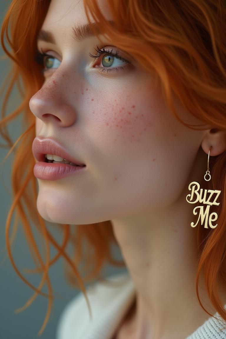 Close-up of the partial face of a beautiful woman with porcelain-white pale skin with freckles, and ginger hair. (She is wearing gold earing with the text "Buzz Me" on it:1.2). Focus on entire image.