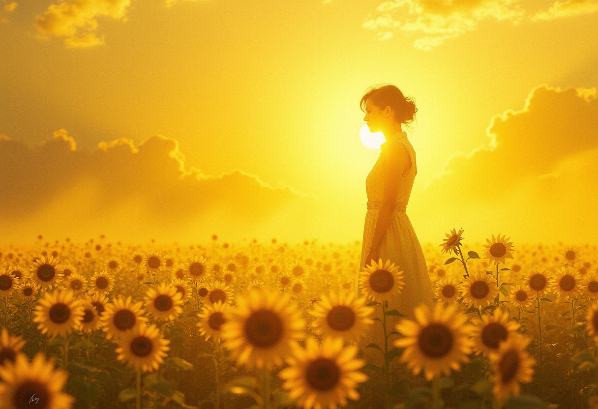 Step into an enchanting realm bathed in radiant golden hues, where a solitary figure stands amidst a flourishing field of sunflowers. Their silhouette glows with a warm glow, almost blending seamlessly with the blossoming landscape. The colors sing in perfect harmony, merging into one harmonious palette, resulting in a breathtaking spectacle of abstract beauty. This transcendent moment captures the essence of light and life itself, a testament to the boundless potential of yellows' captivating essence within this dreamlike landscape. As your eyes feast on this golden symphony, allow it to stir the depths of your soul, awakening a sense of wonder and delight unparalleled by any other visual experience. ,<lora:flux/ck-charcoal-drawing-000014.safetensors:1.0:1.0>