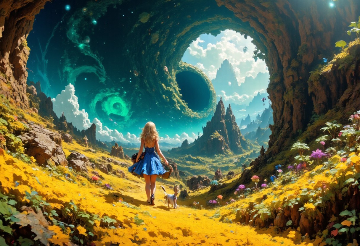 score_9, score_8_up, score_8, 19yo sexy Dorothy walks the iconic yellow brick road with her dog Toto by her side, the golden path glowing warmly underfoot as it winds through a vibrant, dreamlike landscape. She holds her basket tightly, her blue gingham mini dress fluttering gently in a soft breeze giving a peek of her sexy figure and ass. Her dog Toto trots close to her, his small frame alert and loyal, as they move forward with a sense of purpose. At the end of the road, where the Emerald City should stand, a massive, swirling black hole dominates the horizon. Its inky void consumes the light around it, radiating an eerie, otherworldly glow. Dorothy pauses, her posture tense yet determined, staring into the abyss with a mix of wonder and trepidation. The road beneath her begins to distort slightly, the gravitational pull of the black hole subtly warping the scene. Toto barks softly, sensing the danger ahead. The composition captures the innocence of their journey transformed into a haunting allegory, blending whimsy with cosmic foreboding concept art, realistic, Fantastical realism, cinematic lighting, 8k resolution, digital painting, realistic, detailed, fine detail, photorealistic, realistic, hyper-detailed, professional photoshoot, in the style of neil-krug, Fanmytwor style