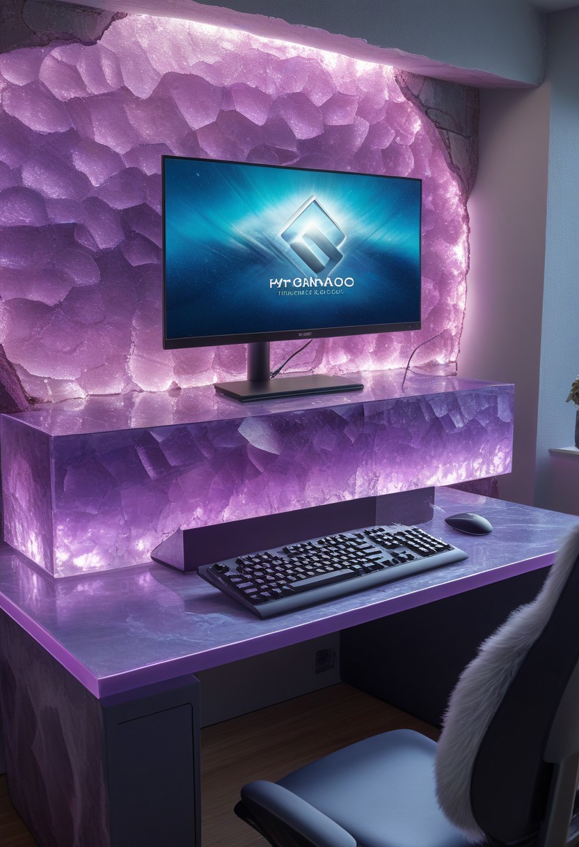 a a gaming pc in flu0rite style, monitor, keyboard, gaming room, detailed, hyperrealistic, masterpiece, magazine advertisement,8K wallpaper, fluorite mineral, iridiscent