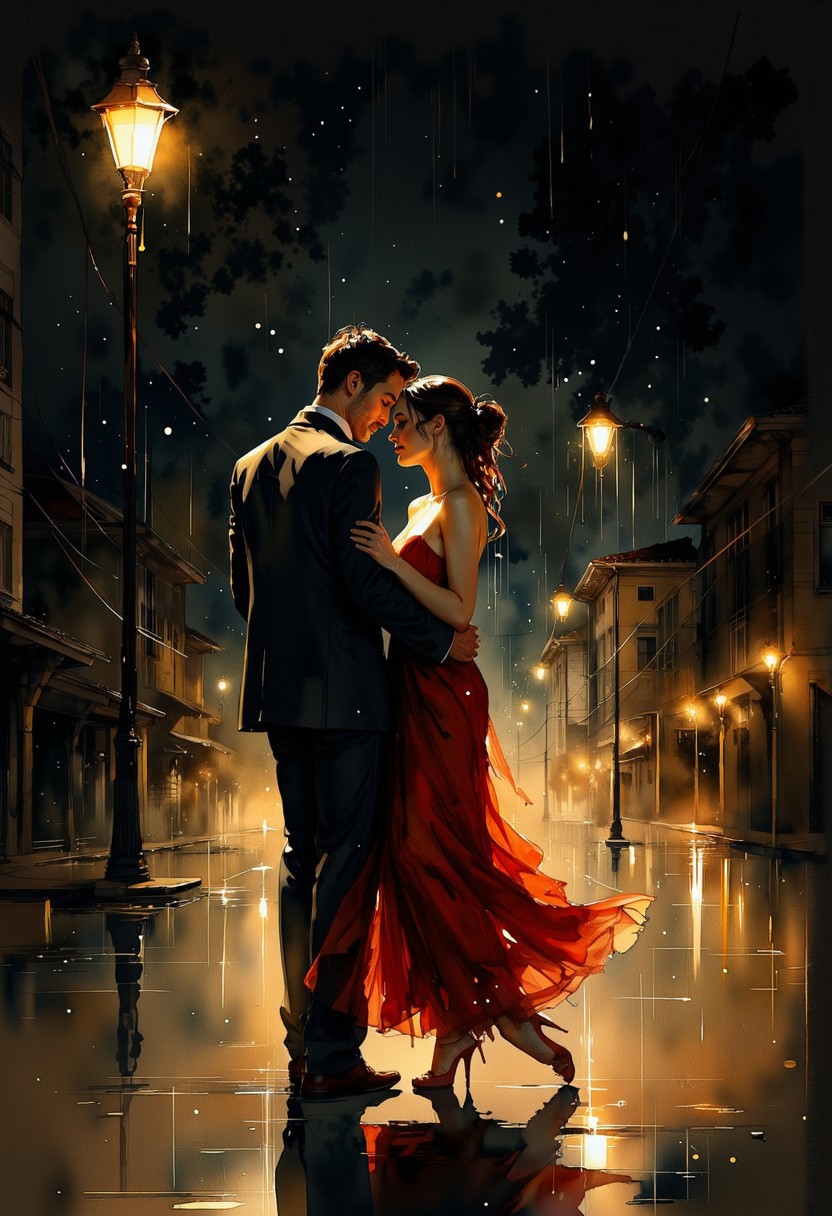 An evocative and cinematic abstract painting captures the essence of a man and woman dancing passionately under a rain-soaked night sky. The woman gracefully dons a vibrant red gown, while the man wears a tailored suit. The dark, rain-splattered street leads to the distant city skyline, illuminated by the golden glow of city lights. The painting exudes a romantic and dramatic atmosphere, with the couple's dance steps merging with the rhythm of the raindrops., painting, cinematic, watercolor, <lora:Watercolor_painting_v2:1.6>
