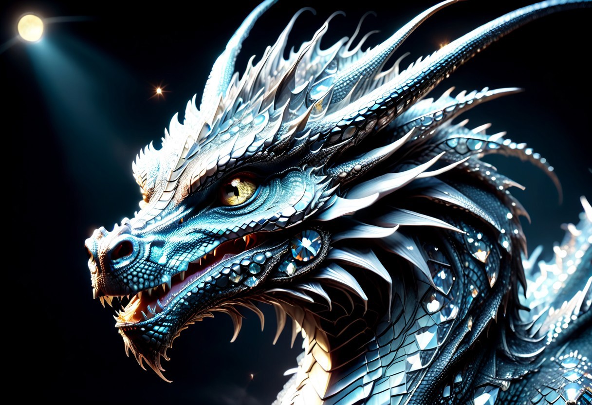 (photorealistic), a diamondMW Unfazed dragon, dark night, photorealistic, highly detailed, 8k, hd, cinematic