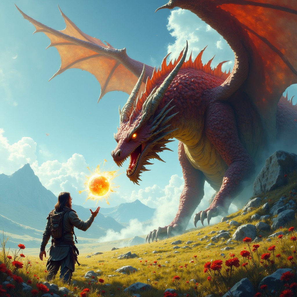 A hyperrealistic fantasy image that captures a breathtaking moment of a man playing fetch with his massive dragon. The scene begins with the man, dressed in rugged adventurer attire, launching a glowing crystalline ball into the air. The ball arcs gracefully, leaving a faint radiant trail as the camera pans to the dragon. The towering dragon, its shimmering scales reflecting fiery reds and golden hues, locks its glowing eyes on the ball. With a powerful leap, its massive wings partially unfurl, creating a rush of wind that ripples through the grass and wildflowers below. The camera focuses on the dragon’s claws as they snatch the glowing ball mid-air, every detail—from the ripple of muscles to the gleam of its scales—captured in stunning realism. The clip ends with the dragon landing, the ground trembling slightly as it releases a triumphant roar, the sound resonating across the vibrant landscape of lush fields and distant, misty mountains. fmb