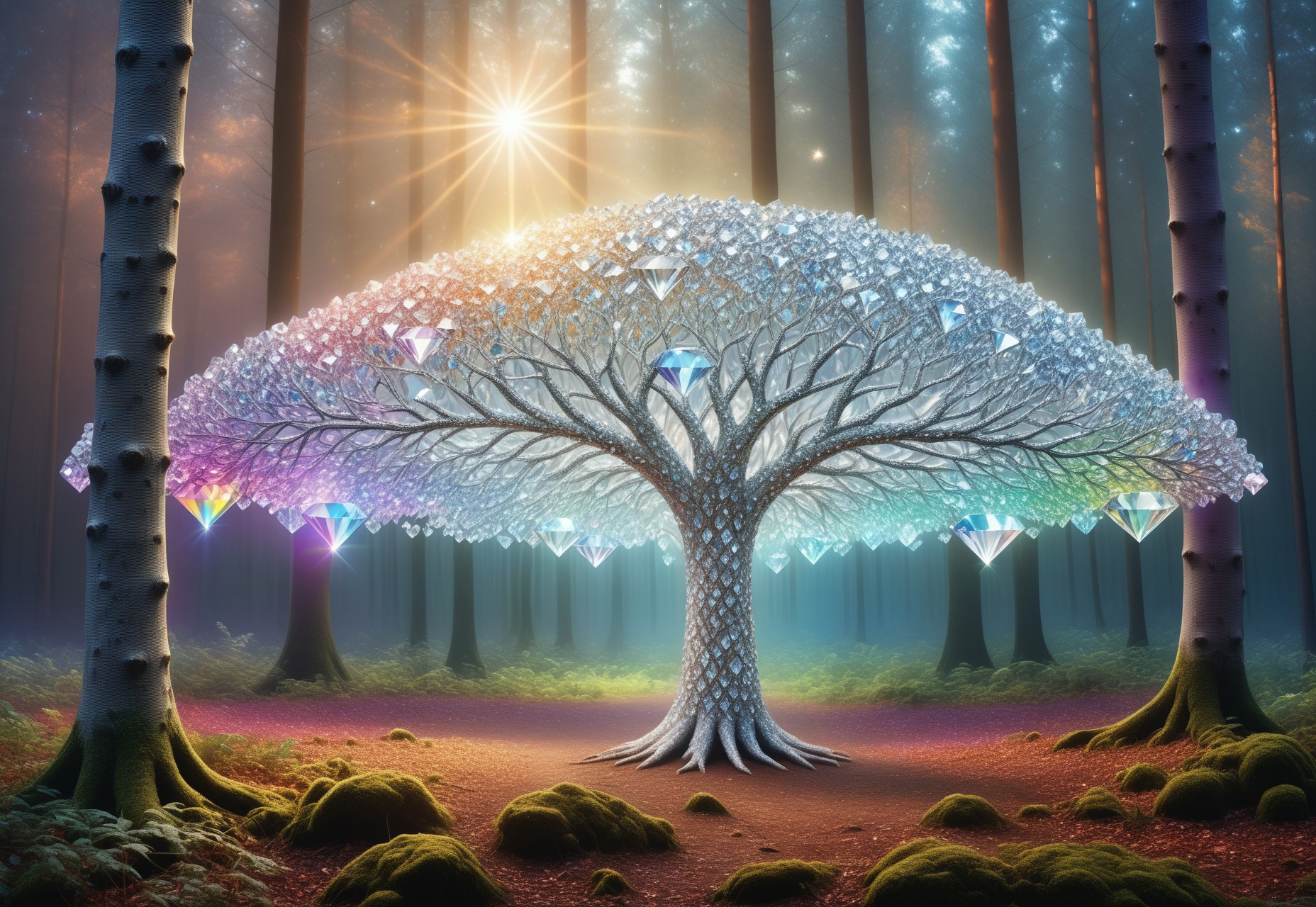 RAW photo, realistic, forest with trees made of diamonds, countless diamonds forming crystalline trunks, glowing leaves refracting rainbow light, surreal landscape, sparkling sky