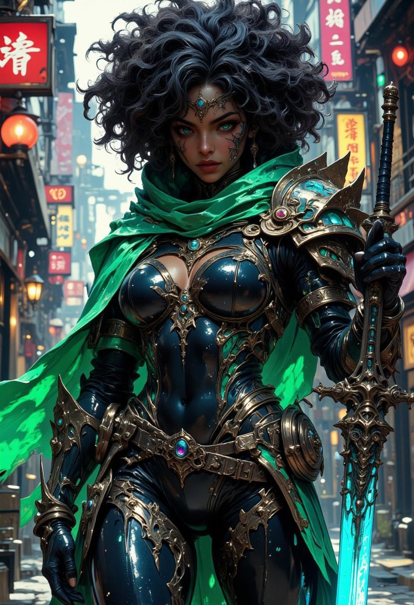This is a high-resolution CGI illustration in a hyper-realistic, cyberpunk style. The subject is a striking, athletic woman with a dark brown skin tone and a voluminous, curly afro hairstyle. She has sharp, piercing eyes and a fierce expression. She is dressed in a futuristic, high-tech armor that is predominantly green and black, with intricate, metallic designs and a green scarf-like material flowing behind her. The armor covers her torso, arms, and legs, showcasing her toned physique and medium-sized breasts. She wields a long, sleek sword with a blue blade, held at her side, ready for action. Her outfit includes various glowing blue accents, and her skin features visible tattoos and piercings. She has a small, ornate earring in her left ear. The background is a vibrant, neon-lit urban street scene, likely in an Asian city, with tall buildings and narrow alleyways., A digital artwork in the style of cknc,