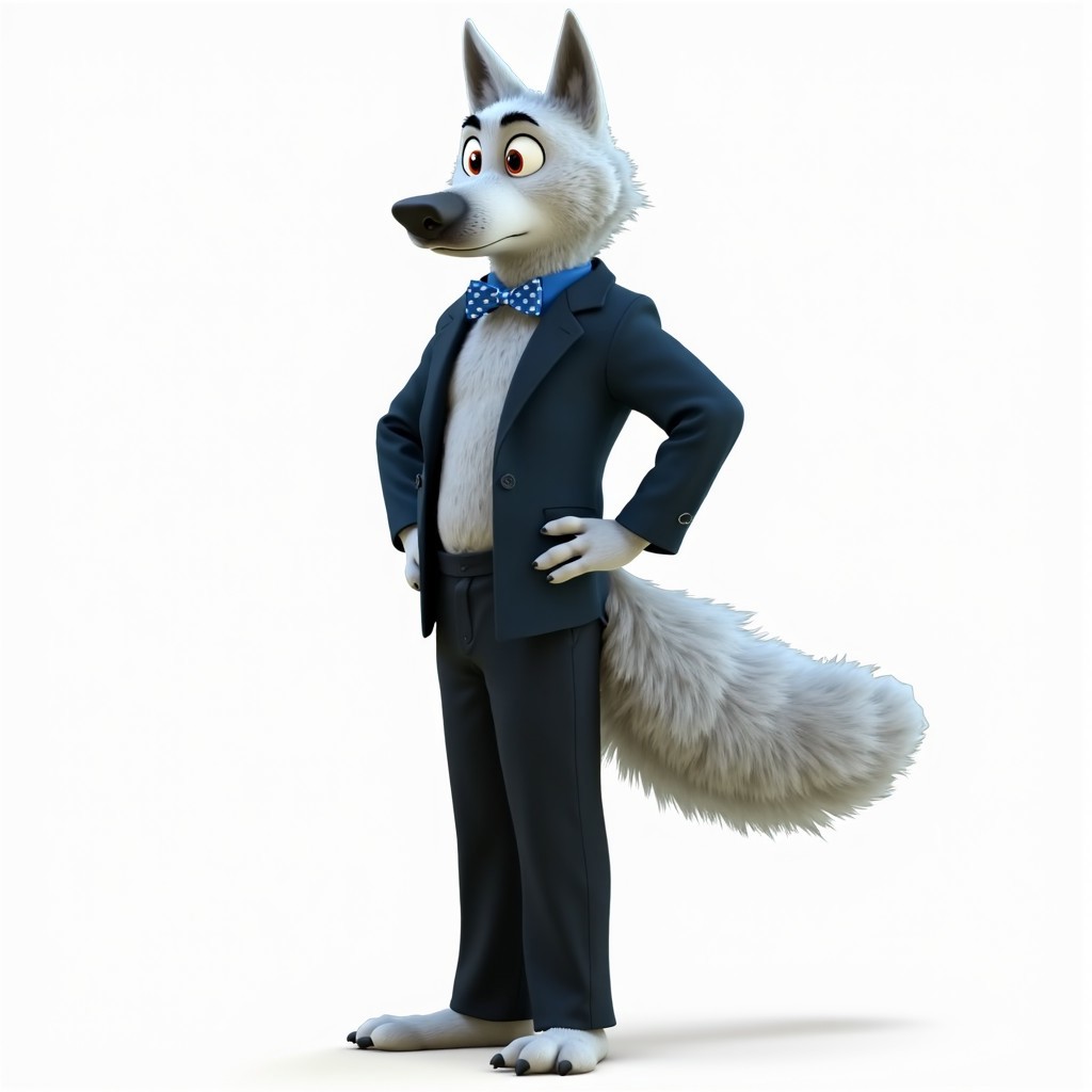 Gary, Zootopia, Wolf, Timberwolf, White fur, Orange Irises, standing, neutral face, hands on hips, shirtless. innie navel, dreseed, blazer, blue shirt,white polka dot bow tie, long trousers, realistic 3D, render, standing, Fluffy, tall, lean
