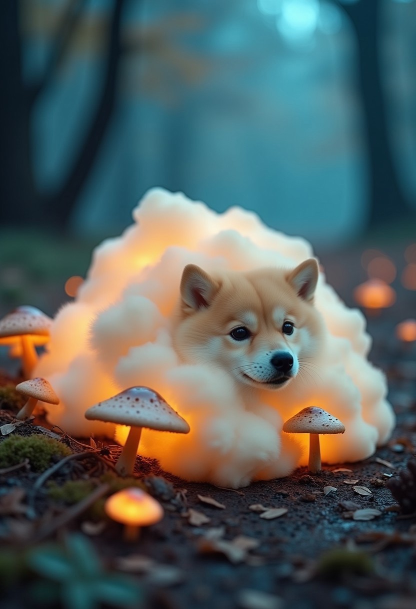 A Doge disguised as a colossal, fluffy cloud, with a gentle smile, is nestled among glowing mushrooms in a magical, blue-hued forest. The mushrooms emit a warm, orange light, creating a cozy and enchanting atmosphere. The Doge's presence adds a sense of companionship and protection to this surreal, nature-inspired setting, emphasizing themes of love, friendship, and serenity. Doge Storm