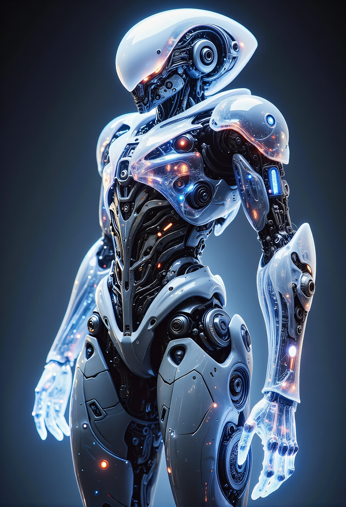 An alien-tech robot with translucent panels revealing glowing, otherworldly energy inside, and limbs that shift and reshape fluidly <lora:Dever_Flux_Enhancer.safetensors:0.5>, <lora:aiai-Glimra-Flux-Dev-v2.safetensors:0.5>, <lora:Instant camera portrait photography V2.0.safetensors:0.5>, <lora:Cyberpunk Realistic V1.safetensors:0.5>,