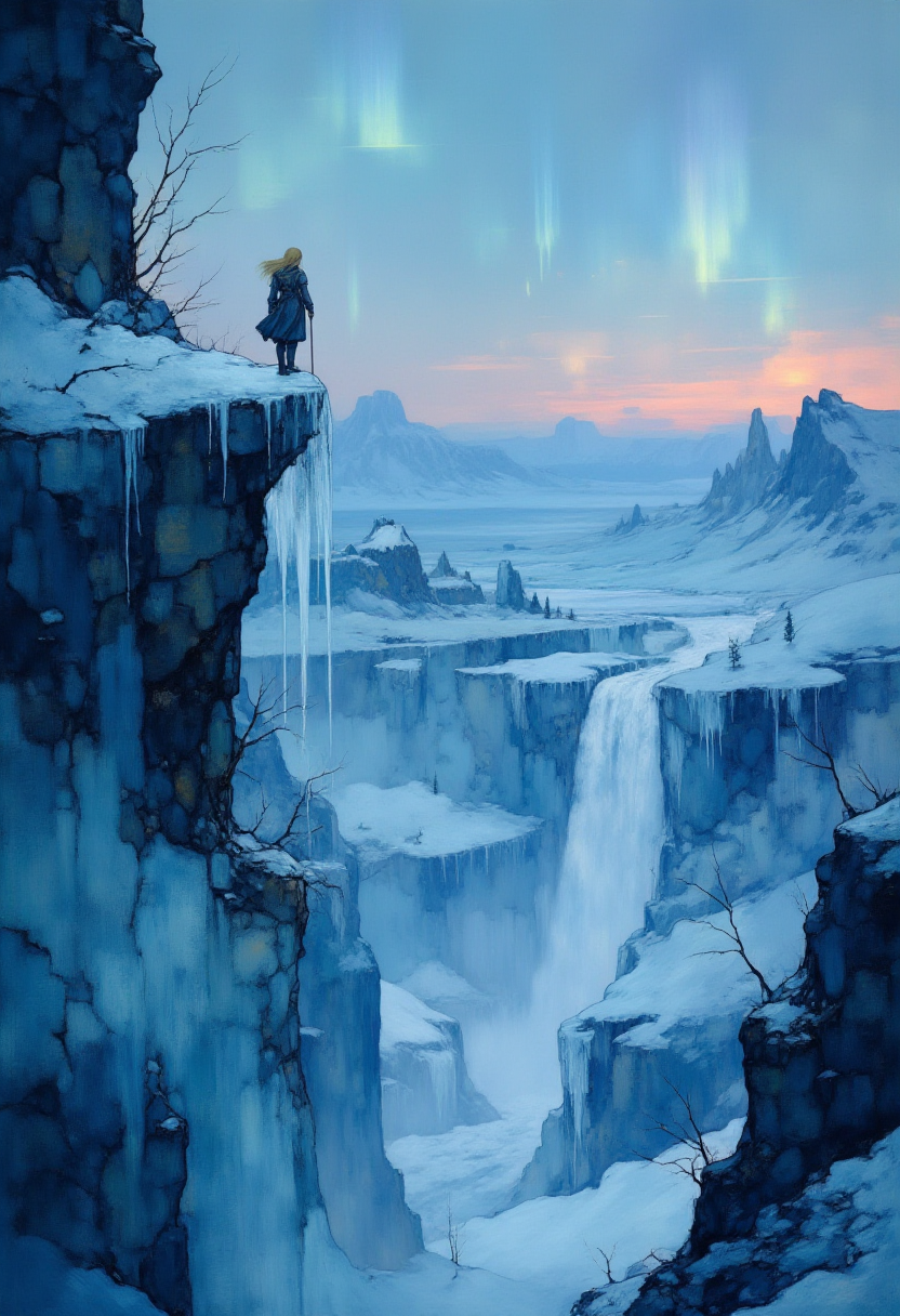 In the twilight hours of a frozen Nordic landscape, a solitary Valkyrie stands atop a towering ice cliff overlooking vast stretches of untamed wilderness below. Her long blonde braids blow gently in the crisp wind, while shimmering armor reflects the faint light of a setting aurora borealis overhead. The waterfall beneath her cracks and groans as frozen torrents melt into translucent icicles, forming an intricate web across jagged rock formations. With fluidity reminiscent of an impressionist painting, capture the haunting beauty of this frosty scene with its moody atmosphere and surrealist elements. Emphasize the contrast between stark whites and delicate blues, highlighting the ethereal glow that surrounds this fearless guardian of Nordic mythology. ,<lora:flux/fav/Digital painting V1.safetensors:1.0:1.0>