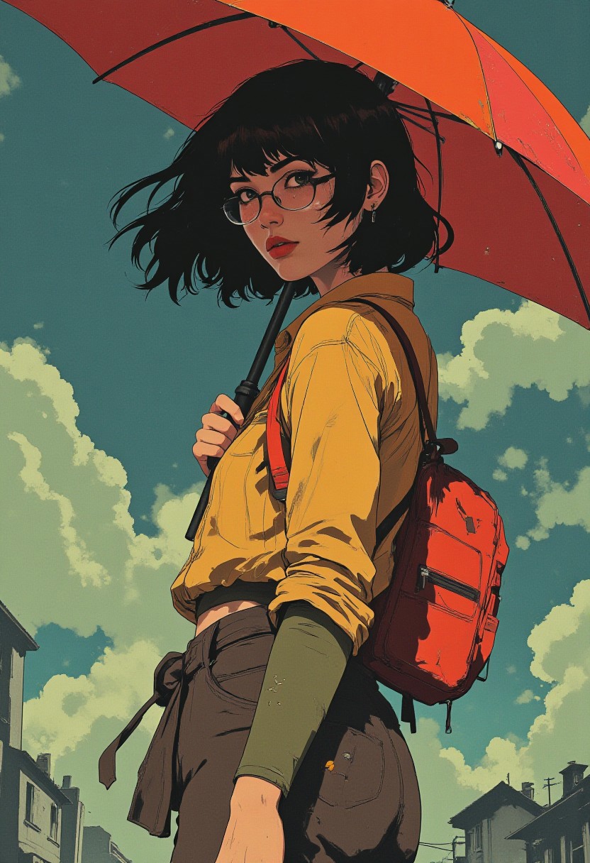 ,,,,,,,,,,,,,,,,anime art , by Ashley Wood, young woman, deep meaningful context backgrounds, umbrella,