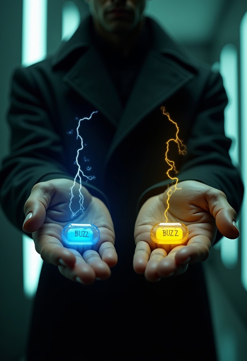 In a dimly lit scene reminiscent of the iconic moment from The Matrix, there is a black man with a dark trench coat with his two hands extended, he is out of frame, only his hands are visible, each offering a different choice. The camera is focused on his hanrs. In one palm lies the Blue Buzz pill, a small transparent pill with a subtle glow of electric blue, with blue lightning, water and clouds surroundint it, in what seems a calm fishing pond, on the pill it says "BUZZ", the text should be clear and exactly. In the other hand rests the Yellow Buzz pill, small and transparent, with yellow lights and lightning surround it, in what seems a strong storm, vibrant and crackling with a lively golden aura, and the text "BUZZ". The text should be clear and exactly.