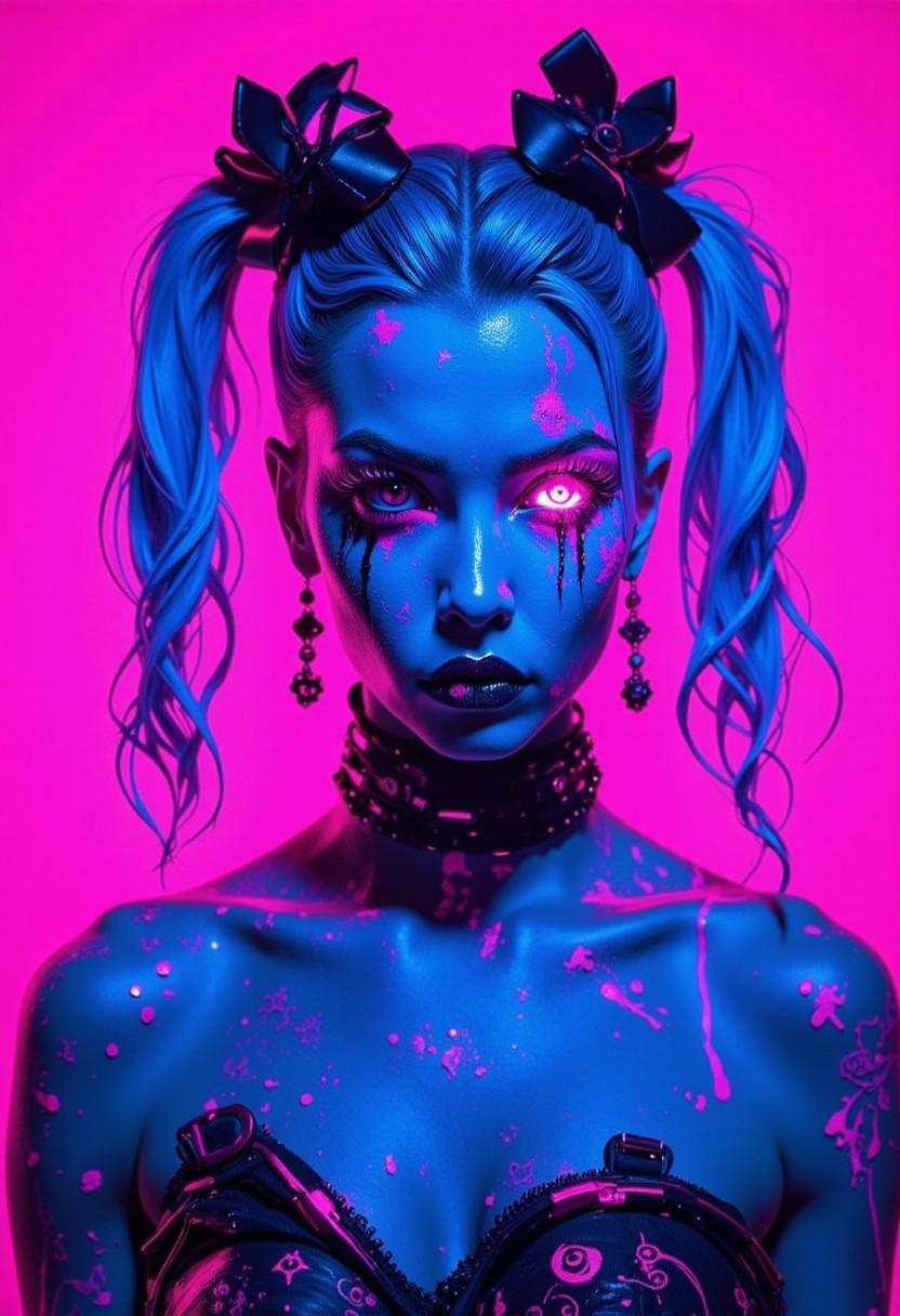 Witch,blue pigtails,ball gown,big bows,the background is a solid, bright pink, which contrasts sharply with her vivid colors, making her stand out vividly, the overall composition is dynamic, with the woman's expression and makeup drawing the viewer's attention, high quality, ultra detailed, colorful, grainy, cyberpunk fantasy<lora:ArcaneFGTNR.safetensors:1.0:1.0> <lora:Flux\boFLUX Neon Abyss.safetensors:1.0:1.0>