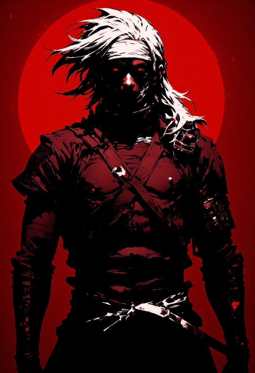 Backlit backlight, The background is a deep, textured red, evoking a gritty and intense atmosphere. The central figure is a battle-hardened ninja, dressed in traditional feudal attire. The ninja's face is shrouded in mystery, with shadows swallowing their eyes, leaving only an aura of danger and determination. Their dark, layered kimono and hakama are accented by a weathered sash, showing signs of countless battles. A white headband, its straps frayed and blowing in an unseen wind, is tied across the forehead, emphasizing their readiness for combat. Subtle metallic elements on the ninja’s armguards hint at hidden weapons or advanced craftsmanship. Their weathered attire is a mix of deep maroon and black, accented with white stitching and ornate, shadowy patterns resembling clan symbols. A short, high-collared cape drapes over one shoulder, tattered and battle-worn. The ninja stands poised, their silhouette radiating both menace and honor, embodying the timeless spirit of a feudal warrior.