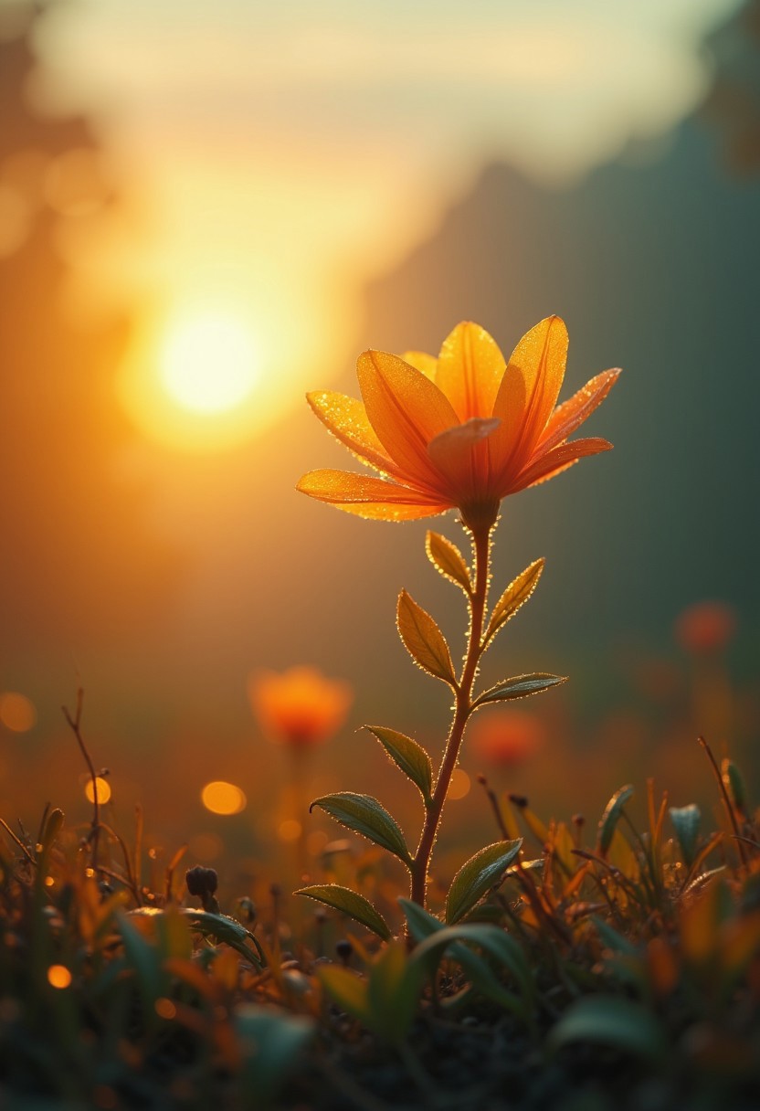 sss, subsurface scattering, translucent. An atmospheric photograph of a blooming translucent flower standing gracefully on a morning meadow. The rising sun shines from behind, casting a warm, ethereal glow through the delicate petals. Dewdrops glisten like tiny jewels on the flower and nearby blades of grass, while a soft morning mist envelops the scene, diffusing the light into a dreamy, atmospheric haze. The overall mood is serene, magical, and filled with the gentle promise of a new day.